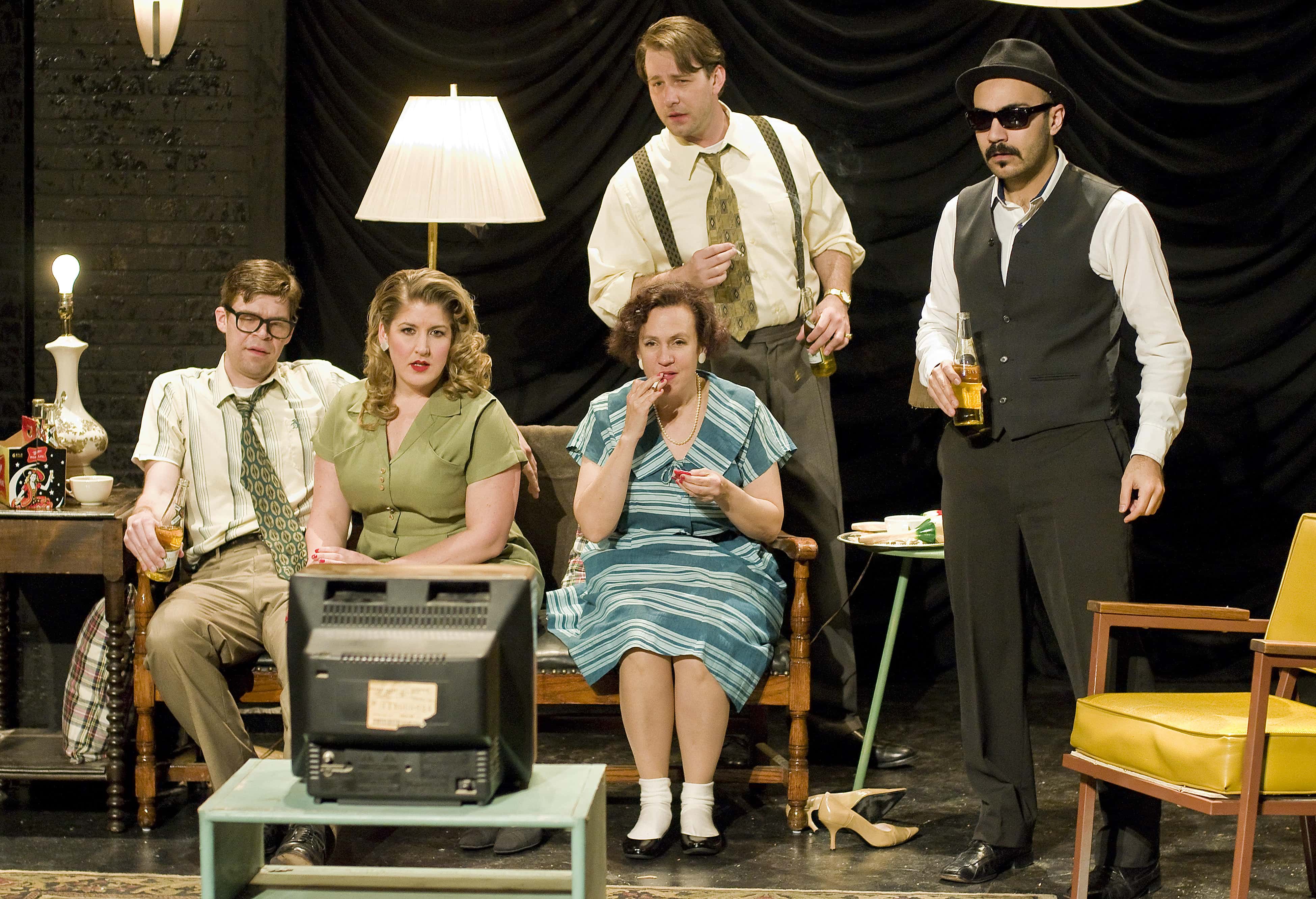Set Designer Steven Royal creates a chill, jazzy vibe by coating the stage in darkness – from the bricks and curtains to the tables and chairs, everything is black. Single light bulbs and simple lamps hang from the ceiling, their yellowed light providing a stark contrast to the rest of the set. Actors carry mismatched furniture onto the set to create a living room, adding and removing props as the plot unfolds. Lighting by Stephanie Freed adds to the relaxed environment through the use of simple white and red lamps, and Sound Designer Thomas Sowers plays soft, sweet jazz music in the background for the majority of the play, alongside cues such as city traffic and ambulance sirens. Cheryl Patton uses costumes to reflect the character’s journeys – from semi-successful tan suits to simple slacks. Most noticeably, a young woman in pretty dresses and carefully curled hair shows less and less effort in her appearance as her life wears on, finally succumbing to tattered housecoats and slippers.