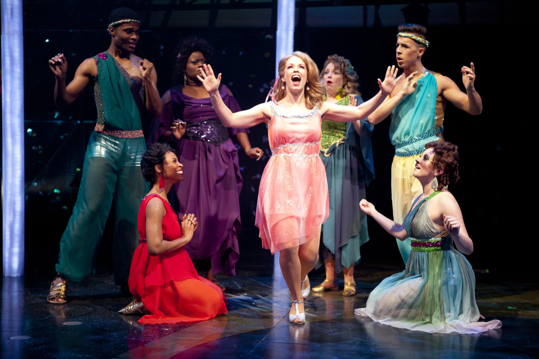 A quintessential 80’s piece, everything about this production is amped up. Lighting Designer Chris Lee does not disappoint, with the trunks of the palm trees blazing vivid colors throughout the show, and disco balls that refract light into a million revolving spheres. Kathleen Geldard brings the 80’s back with her costumes, managing to put tie-dye patterns, headbands, satin shorts, roller blades and leg warmers together in a single outfit. As the majority of the characters are Greek Goddesses, sparkly, gauzy dresses also sweep the stage, and bouncy curls sit atop shoulders that have been liberally painted with glitter. The effect is remarkable, and coupled with their airy choreography, I would not have been surprised if the goddesses had risen into the air and taken flight.