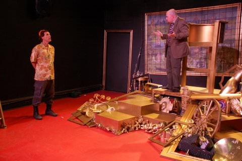 Steven Royal’s beautiful set consists of a pile of gold objects in the center of the stage and a gold ladder off to the side. On top of the gold mountain sits a golden throne, which later becomes the interrogation chair. When I have seen plays about hell in the past, the set usually consisted of the cliché red and orange flames. I enjoyed the creative spin on Royal’s set and when combined with the tight feel of the black box theater, it helped draw me into the play.