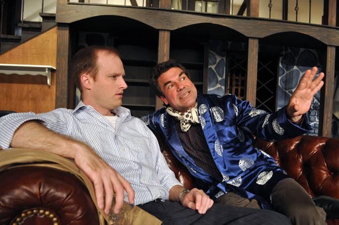 Sleuth is an inherently talky play with monologues that sometimes enhance and sometimes distract from the character development. Although the first act is long, Beth Hughes-Brown keeps the pace moving along like a downhill skier on a slalom course building speed with each twist and turn. Patrick David’s elaborate two story set design is absolutely amazing. He expertly recreates an old Tudor manor house of the 70’s by filling the stage chock-a-block with nostalgia such as an avocado green phone, grandfather clock, board games, stone fireplace with mantel and real fish tank. Chip Gertzog’s choice of Italian opera adds to the emotional tension. During a critical scene Milo sings and laughs along with the aria, while visually transforming into the butt of the joke, a clown. Derek Bradley’s grey pinstripe suit and his Parker Stevens-type 70’s era hair style designed by Katie Brown and George Smith adds to the play’s vibes.