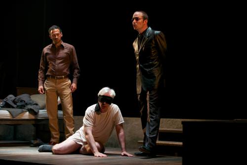 The set design is simple with lots of room. A desk where Cohn (John P. Keller) is working on a book with Malkin is on the far stage right. On the left is the Israeli office and towards the center is Eichmann’s quarters. The show opens with a classic car on stage and the abduction of Eichmann (Phillip Goodwin). David Barber does a solid job with the set design, which includes a large screen with storm clouds, and some fine sound effects.
