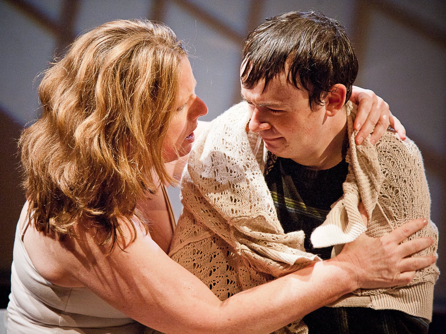 Joyce (MaryBeth Wise) comforts a very distraught Jared (Adi Stein). Photo by C. Stanley Photography.