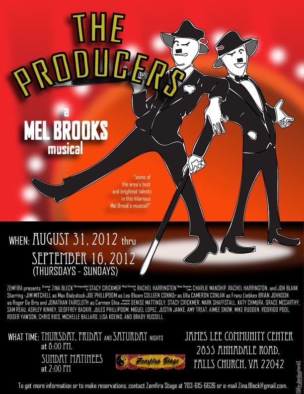 Zemfira Stage’s production of The Producers plays through September 16, 2012 at James Lee Community Center – 2855-A Annandale Road, in Falls Church, VA. Tickets are $15 and can be reserved by calling (703) 615-6626, or by purchasing them at the box office prior to the show with cash or check only.