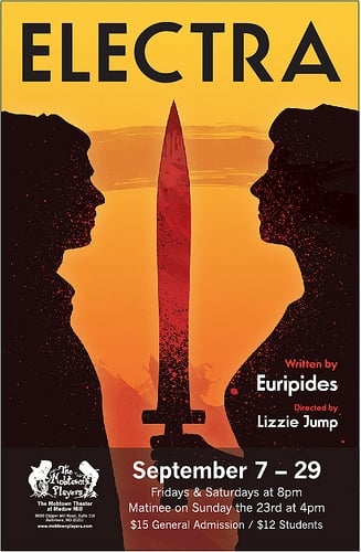 Electra plays through September 29, 2012 at Mobtown Theatre at Meadow Mill -3600 Clipper Mill Road – Suite 114, in Baltimore, MD. For tickets, purchase them online. Performances are Fridays and Saturdays at 8 p.m., with one Sunday matinee Sept. 23 at 4 p.m. Tickets are $15 general, $12 for students.