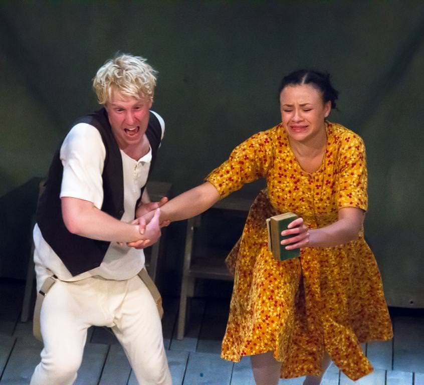 Tom Lawrence, in one role as Horatio, gently embraces Hamlet in the latter’s death and plays other roles including Reynaldo and Captain. Peer also plays Voltemund, while Romain plays four roles, including Bernardo and Lucianus, as well as those mentioned above. Saul plays a befuddled Player as well as Francisco, First Gravedigger, and Priest. Each actor brings new, fresh passion to their multiple roles. Their energy is especially palpable during the Players’ scene, with nearly every actor onstage save Hamlet literally running around in their guises as multiple roles in the same short, entertaining scene.