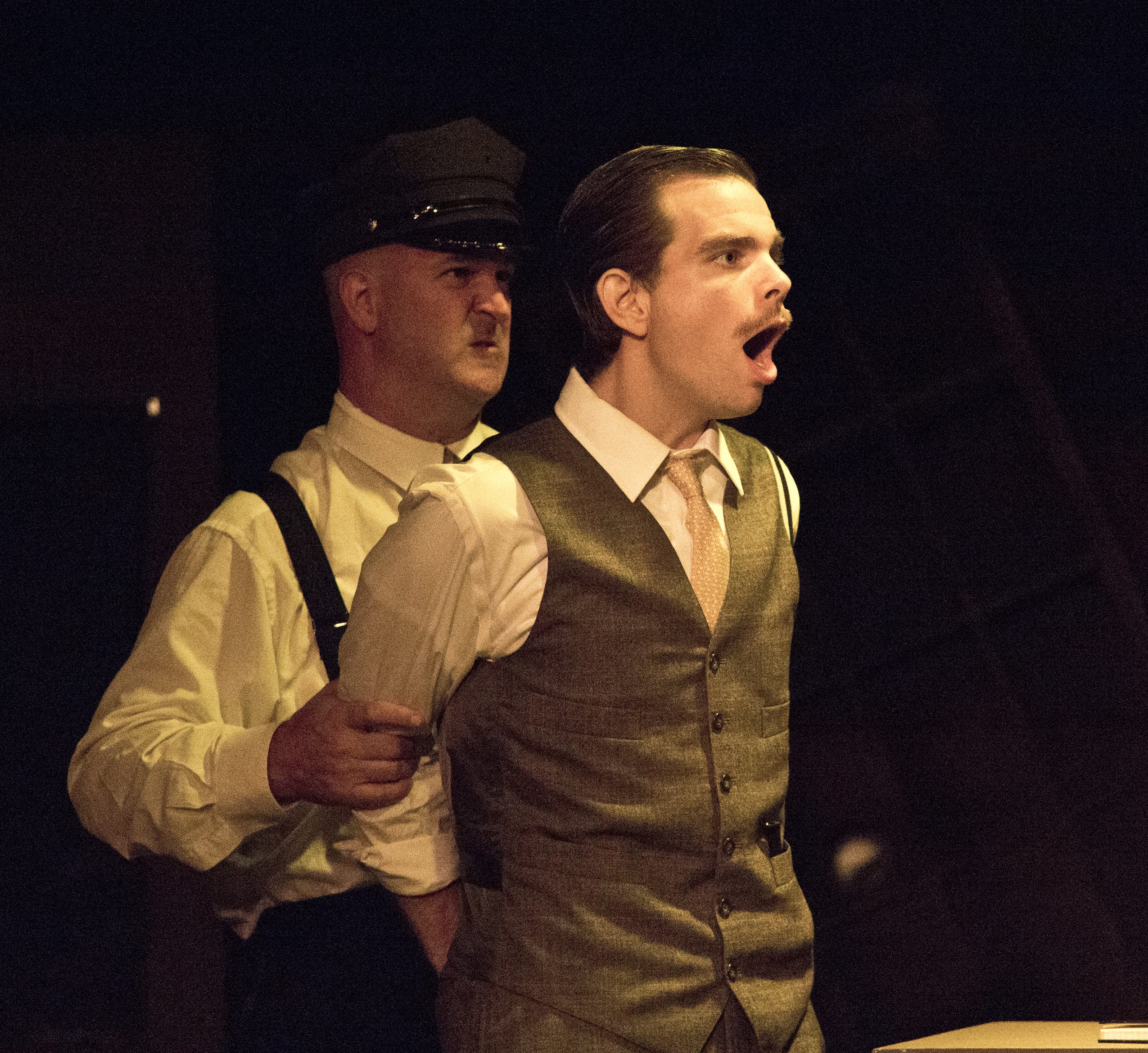 The uproarious laughter comes from Clown 1 (Andrew L. Baughman) and Clown 2 (Tad Janes). Together their hyjinx adds up to instant hilarity as they jump from character to character creating instances of several people existing on the stage when in reality it is never more than just the two of them. The infamous hat-swap scene on the train is executed to perfect between these two creating several minutes of gut-busting hilarity as they rapidly flip between a series of several characters in a matter of seconds.