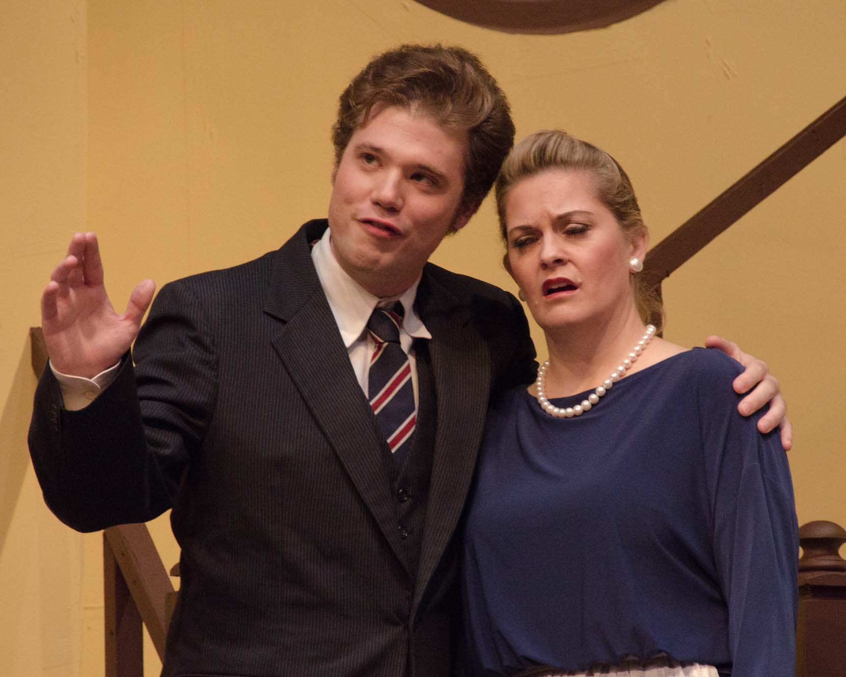 The Little Theatre of Alexandria is known for its elaborate sets, and Funny Money is no exception. Designer Marian Holmes shows the interior of a charming home, with polished wooden furniture, floral arrangements, and framed artwork. David Doll, Dan Remmers, and their team construct a set of handsome sliding doors, which offer a peek into an offstage dining room, and a staircase that leads to an upper level. Sound Designer David Correia uses special effects like talk-radio and a ringing telephone, and the stage remains well-lit throughout the production by Lighting Designer Chris Hardy. Beverly Benda chooses costumes fit for the upper-middle class, utilizing suits, overcoats, and housedresses paired with pearls.