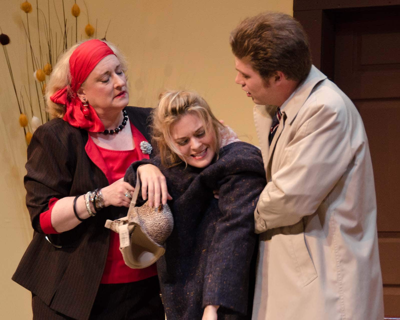Jean Perkins (Charlene Sloan) is busily preparing a birthday dinner for her husband, Henry (Erik Harrision), when he enters the home in a zombie-like state that quickly dissolves into a manic frenzy, during which he insists that she pack a bag so that they can leave the country at once. Henry explains to his startled and confused wife that he mistakenly picked up someone else’s briefcase upon leaving work…and that briefcase happens to hold a large fortune in cash. What follows is a frenzied evening full of visitors, accusations, mistaken identities, and other various falsehoods. Gayle Nichols-Grimes and Ted Culler play Betty and Vic Johnson, friends of the couple who arrive to celebrate Henry’s birthday, and instead find themselves woven into a tangled web that includes two federal agents (Larry Grey as Inspector Davenport and Marisa Johnson as Slater) and a put-upon cab driver named Bill (a riotous John Shackelford).