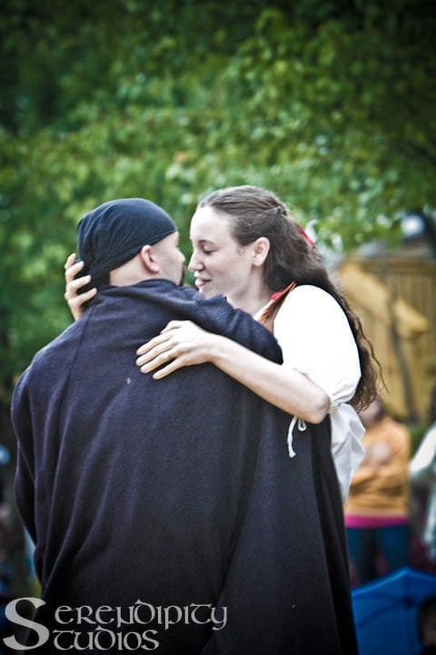 This also means finding time to have special moments together while at work. In 2010, during Johnny’s first season at the faire, he played French explorer Guillaume le Testu. Before his fight in Human Chess, he would declare to the Queen, “Your Majesty, because I am French, I must have the kiss of a beautiful woman before I fight!” Normally, on days when I was not there, he would kiss fellow actor Sarah Knittel, who played the Wine Mistress that season. (She currently plays the zealous Sheriff of the Shire, Penelope Jacket). However, when I was there, he would ask the audience for volunteers. Naturally, he wouldn’t pick a random stranger; unbeknownst to the audience, he was not looking for anonymous volunteers. He did it as an excuse to pull me out of the audience for a dip and passionate kiss. With the exception of Halloween, I’d typically dress in “civilian” (i.e. normal, non-Renaissance) clothing to make it appear that he fervently kissed a complete stranger – which inevitably shocked the audience. It was a special moment, and I certainly looked forward to it.