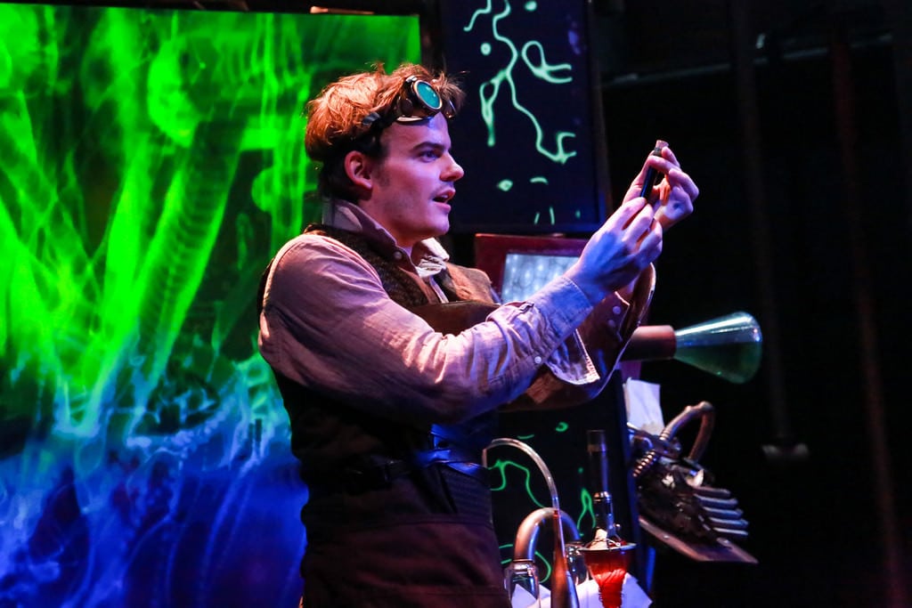 Alex Mills is stunning as the beleaguered Dr. Jekyll and frenetic Mr. Hyde. This show is all about the battle of good versus evil within one man and he powerfully portrays the conflict within the man’s soul. In one scene we see the doctor break into his fiancée’s bedroom and approach her sleeping in bed. Mills expertly shows us how the doctor’s dark side desires to ravish his intended while his good side is fighting desperately to save her from himself. Mill’s physical manifestation of the doctor’s anguish over his divided soul is astounding to watch.