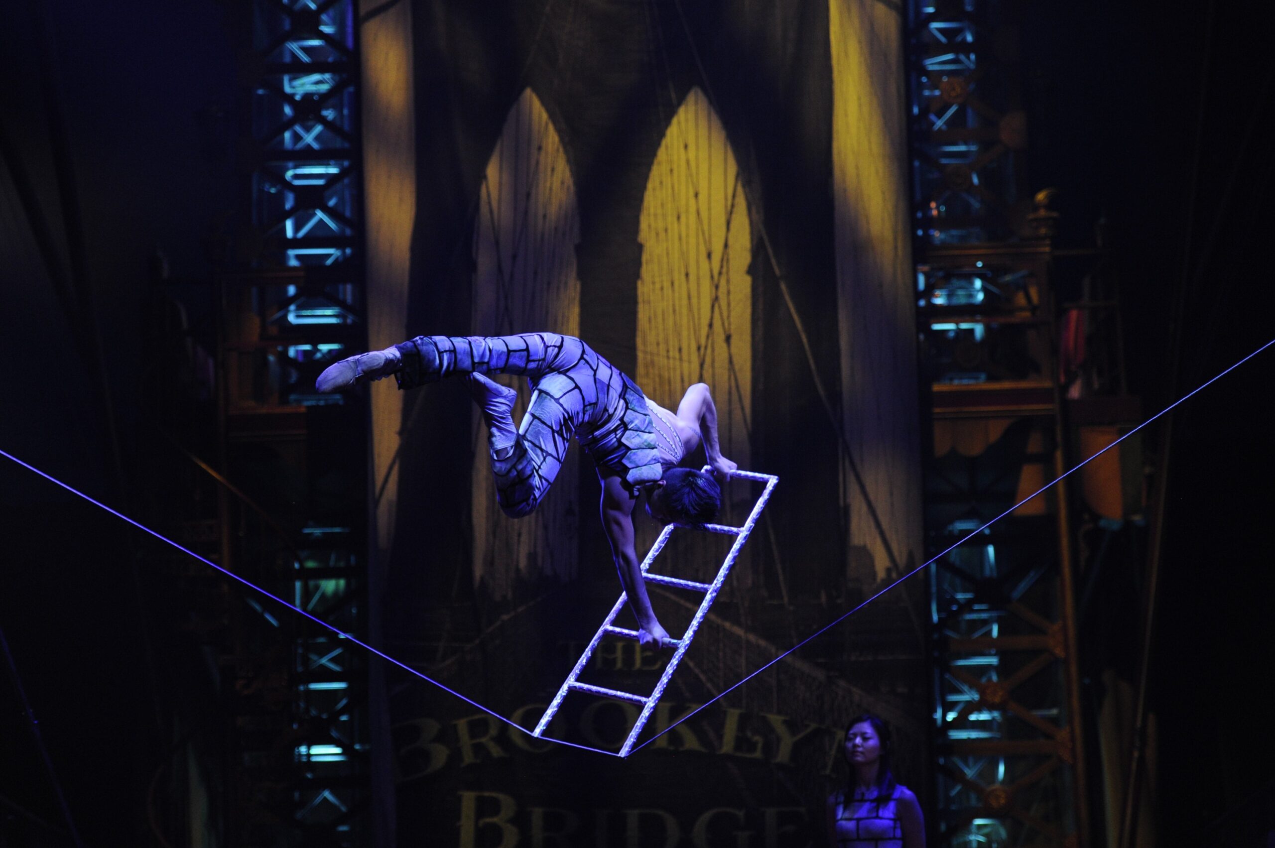 Ringmaster John Kennedy Kane was an entertaining showman who guided the audience from act to act which is exactly what you want from your ringmaster. Under the direction of West Hyler and artistic direction by Guillaume Dufresnoy the show runs smoothly through the program. John Lee Beatty has created a sparse set within the tent. Obviously there is the ring but in the back is the ring entrance which is created to hold the band. The setting has an old fashioned circus feel to it and adds to the show. Howell Binkley‘s lighting shined spotlights on the performers and acts.
