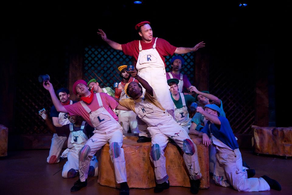 Then we jump up the line to good old down on the farm Levi (Chris Rudy.) Driving the herd home during “One More Angel In Heaven” Rudy digs his spurs right into the role, rippin’ up the stage with a rootin’ tootin’ good boot stompin’ and a great cowboy sound to his powerful pipes. Rueben (Alan Hoffman) the eldest of Jacob’s sons. Hoffman completes the around-the-world circuit of the brothers by landing us in gay Paris with his charming French approach to “Those Canaan Days.” With another brief ad-lib, Hoffman lights up this number in a manner that does justice to the city of lights. His voice is strong and caries delightfully over the other ten brothers on the stage.