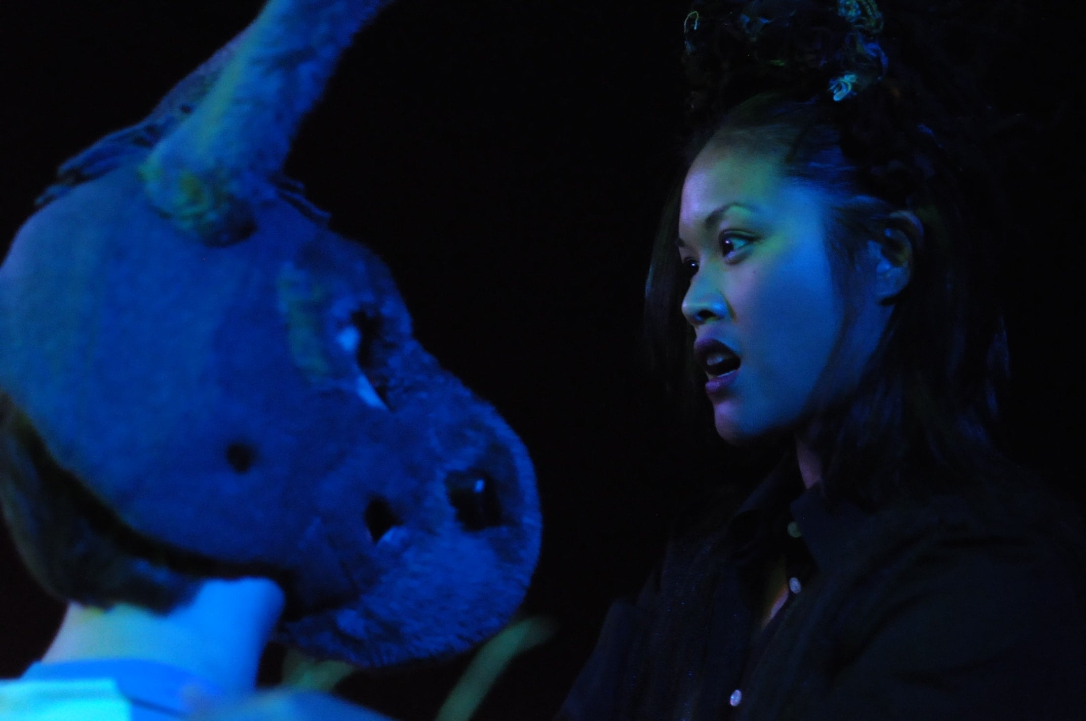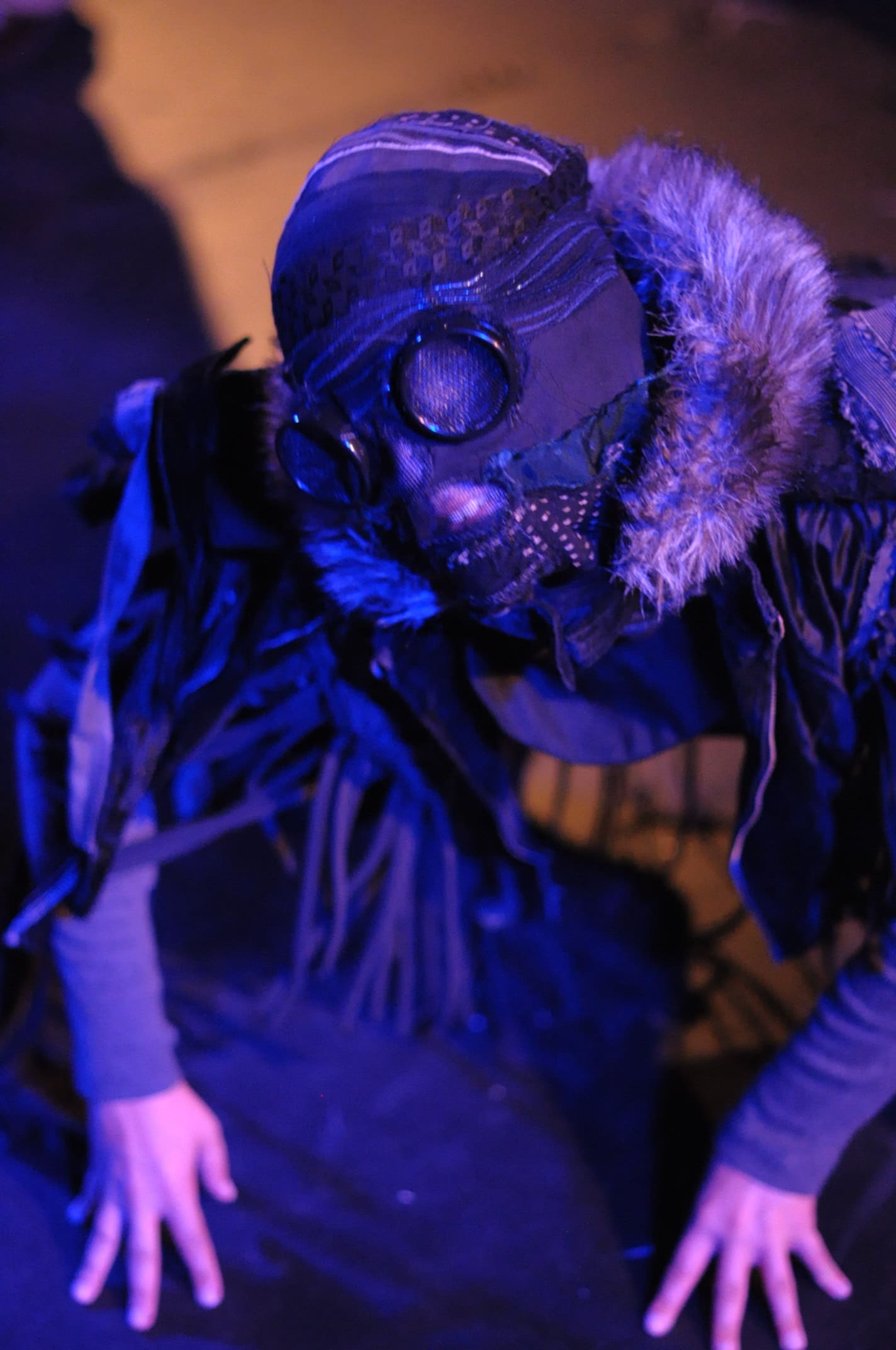 Puck (Elizabeth Galuardi) dressed as a creeping black gremlin in a Steampunk facemask is a dark incarnation of this sprightly faerie. Galuardi spends her time embodying a grotesque sort of creature that grovels and scrapes about the stage, speaking in harsh tones that show the characters malicious and mean-spirited side rather than the more fun-natured mischief that is so often associated with the character. Her shadow double, Justin Johnson creates a sharp contrast, literally moving about like her shadow in darkness, making it doubly dangerous to cross paths with the imp.