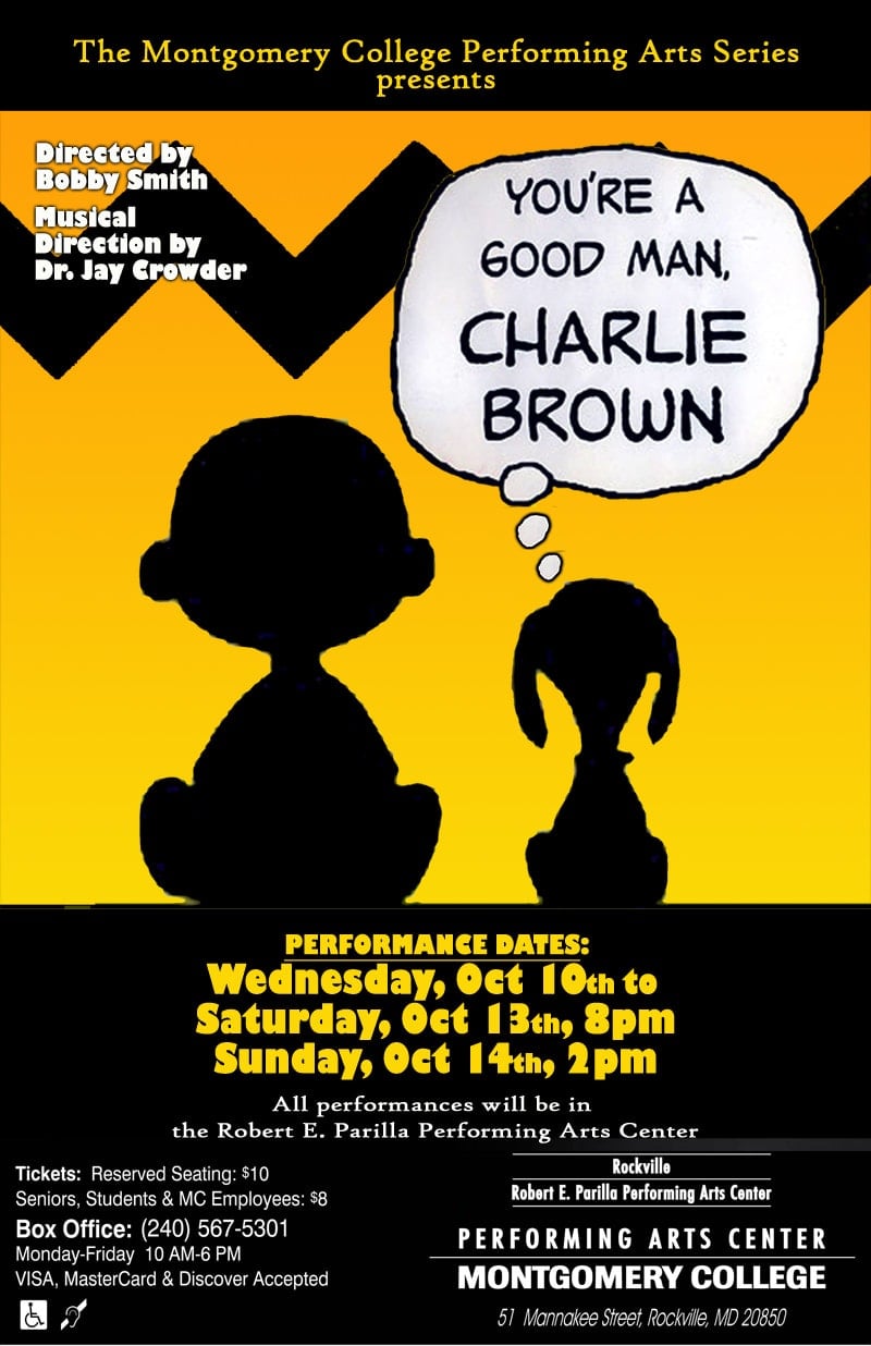 Good grief! Did you hear? The Department of Theatre at Montgomery College is presenting You’re A Good Man, Charlie Brown to kick off the start of their fall season. Directed by James Gardiner with Musical Direction by Dr. Jay Crowder, the Peanuts gang, created in comic form by illustrator Charles M. Schulz, is back together on the stage for a limited engagement! All of your fun-loving favorites are there; Charlie Brown, Linus and his blanket, Sally, Lucy, Schroeder, even Snoopy! Follow these loveable characters through little comic scenes with musical adventures to perk up their candid humor. It’s just like you remember them, only now they’re live on stage.