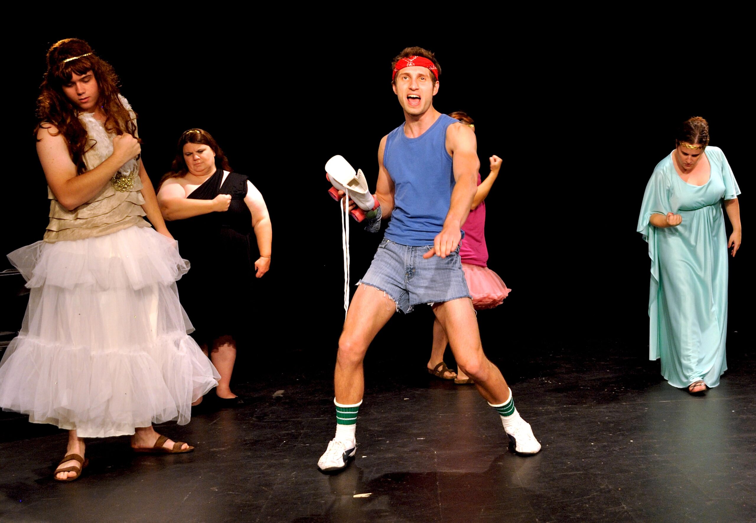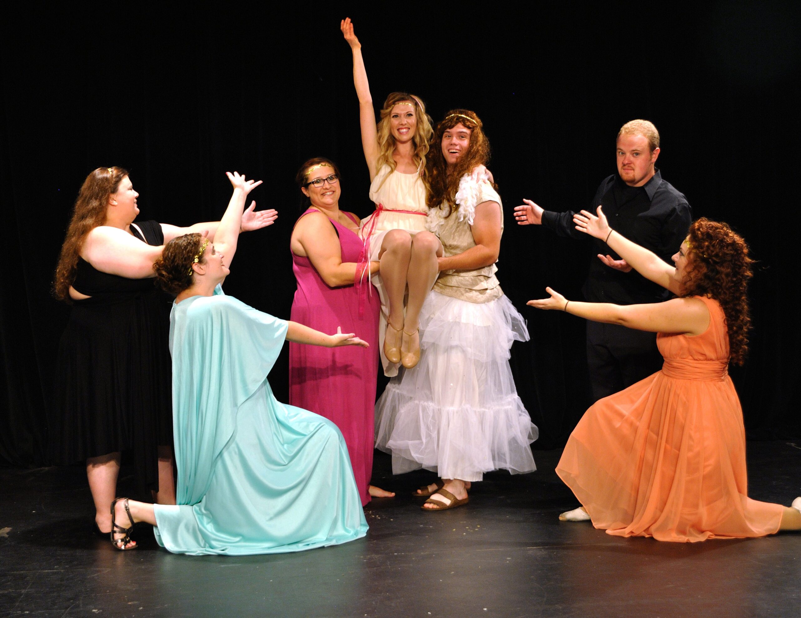 Jacob Waeyaert and David Weiner play several roles in the musical. Portraying Clio’s sisters in drag – were some of the production’s most humorous scenes. Teri Magers (Melpomene) and Ally Jenkins (Calliope) are dynamite on their musical numbers of “Evil Woman” and “Strange Magic.” Ally’s facial expressions during “Evil Woman” are hysterical and will have you howling, as will Tm Eichelberger, who is at his best as Bob and Centaur. Tim started the laughs when he dropped his broom and quit sweeping up the confetti in the opening scene. Karilee Grossnickle, Momo Nakamura, and Carey Raush also contribute to the hilarity and craziness.