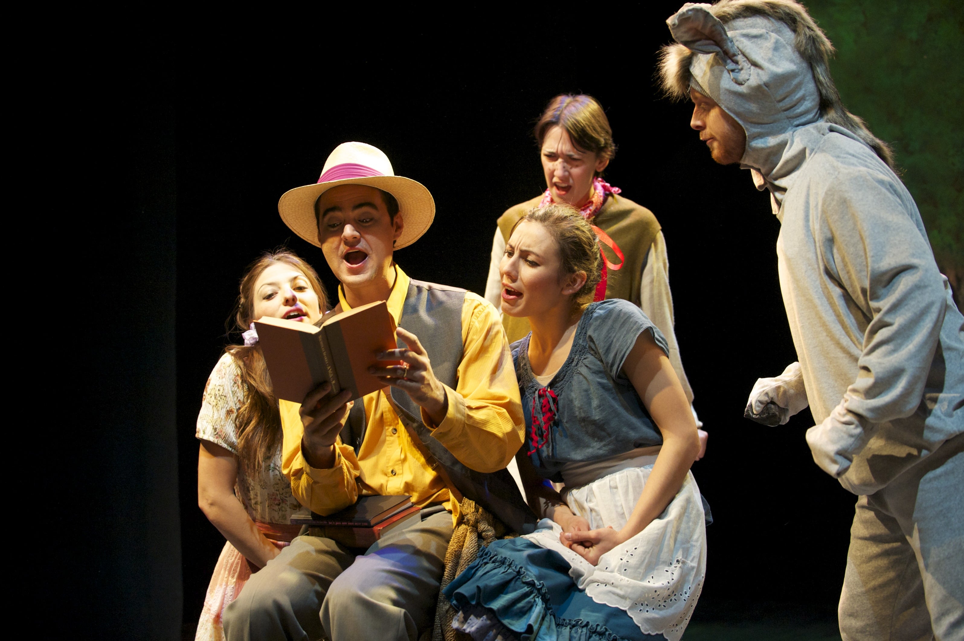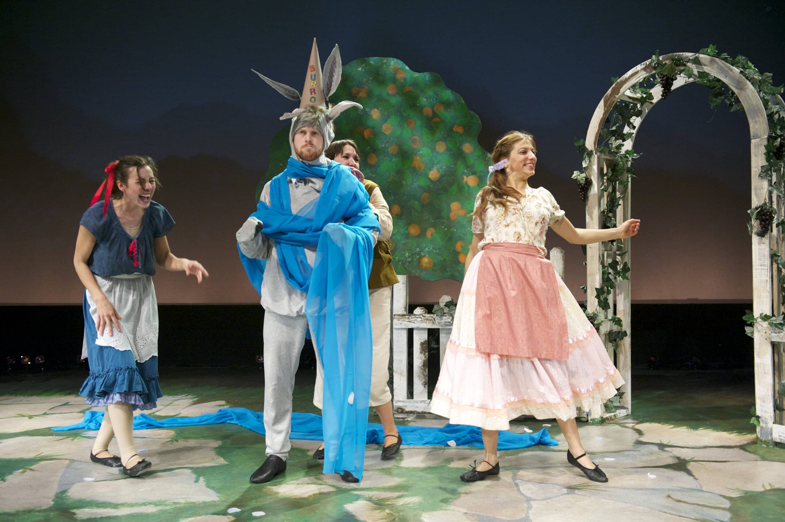 Scenic Artists Ashley Washinski and Ariel Klein create a storybook land with a large painted fruit tree and a huge white trellis and picket fence covered in ivy. The rest of the scenery comes from the brilliant imaginations of the youthful audience as they watch Platero (Bob Sheire) and The Poet (Tim Pabòn) travel across the stage moving through pastures, over rivers, through orchards, and more. The rivers are made of bright blue silk scarves that flow the length of the stage and are then used a colorful jump ropes and sashes for the girls of the village; adding a whimsical aspect to the performance.