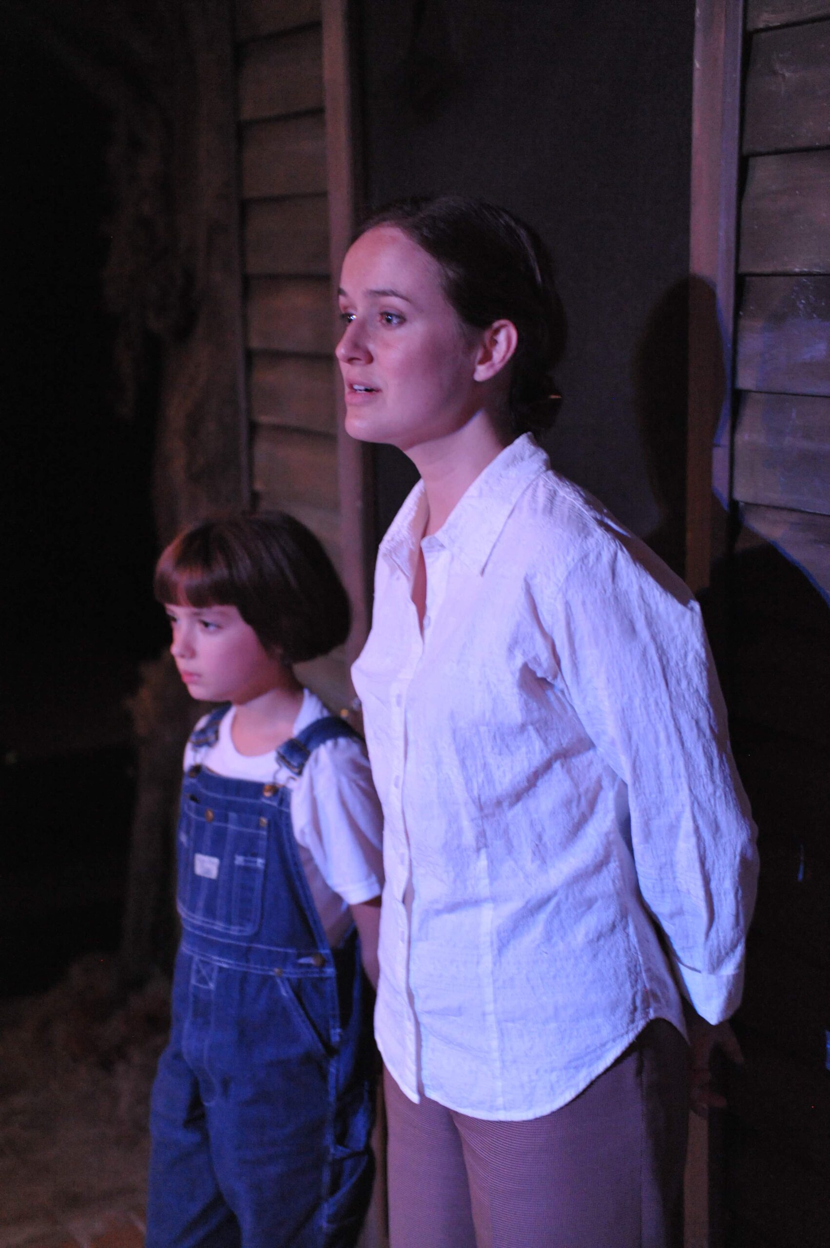 Scout (Maggie Baum) is the spitfire of a young southern girl trying to learn her place in the world while learning the world is indeed a different place. Baum interacts with her older self, Jean Louise (Elizabeth Jernigan) without every consciously interacting with her. The pair appear on the stage at the same time, Jernigan as a shadow of her former self with Baum acting like a replayed memory. Their physical union match impeccably with one another, from the facial expressions right down to the way they pronounce and articulate certain words.