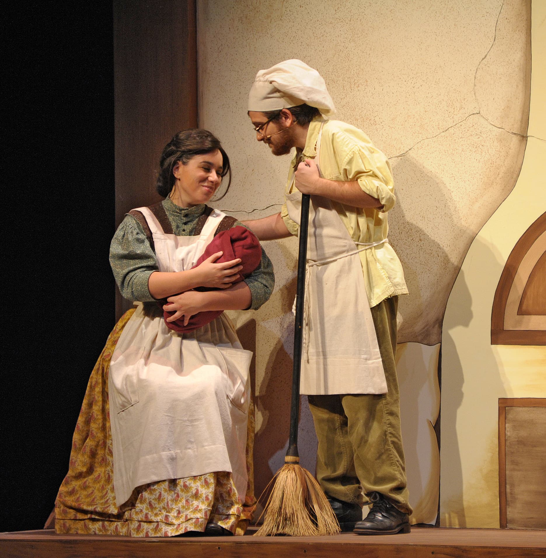 Overall, the scenic design by Dana Maier was helpful to the success of the production in that it grounded the overlapping themes and events of four tales which constantly crisscrossed and collided as scenes rapidly unfolded. I would have liked Lighting (Liz Replogle) to more clearly emphasize the change in locations, e.g., when the scene centered on Kate Merryman (Cinderella) at home counting lentils or Cara Pellegrino (The Baker’s Wife) at home when the first cow escaped. Howard Vincent Kurtz’s costume designs were colorful, believable, and appropriate for the period and complemented the actors’ natural movements.
