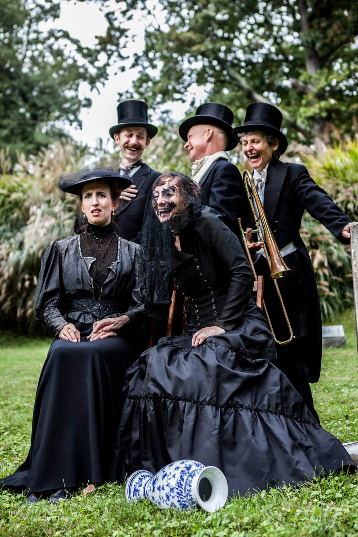 I would be remiss if I did not mention the grisly songs which trickle their way into this work of gothic art. Being sung by the women (Mandell, Gwen Grastorf, and Sarah Olmsted Thomas) is a number from 1922 entitled “The Sneak.” It’s a swanky charming little number and fits the saucy air of the moment. We hear a haunted melancholic tune from Thomas early in the show, “Where Is My Sailor Boy?” singing with perfect pitch like the voice of a ghost whispering across the ocean as she laments her drowned love. And the whole cast comes together for a romping good ditty led by Mandell, “Nix on the Glow-Worm, Lena!” We get a good sense of the gloomy comedy from the various musical interludes; definitely keep your ears open for “Gloomy Sunday” as well.