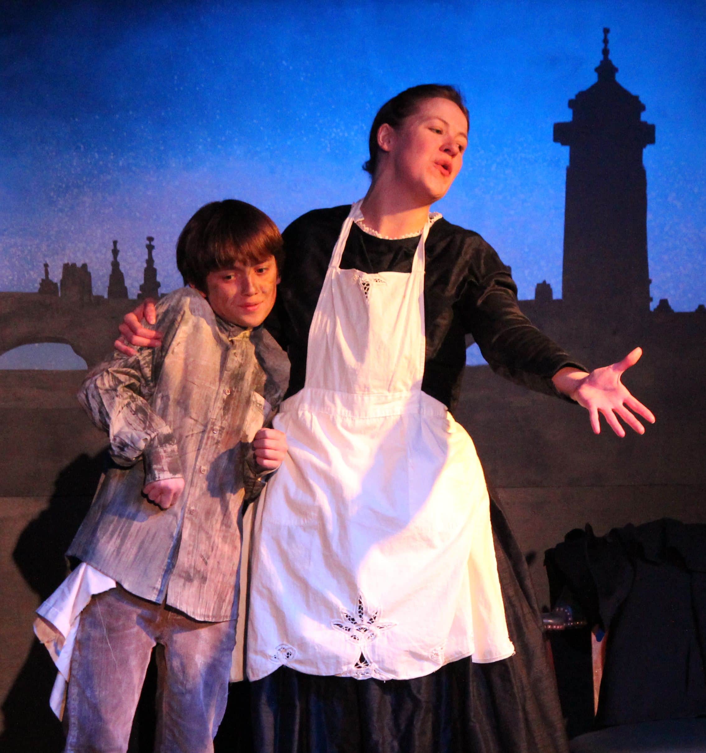 Scenic Designer Margie Jervis aspired to create a graphic novel effect for this production, and does so with an illuminated London skyline painted against a black backdrop. A couple of elevated platforms allow the large ensemble to maneuver themselves creatively in the intimate space. Jervis is also the Costume Designer for this production, and brings the Victorian era to life with top hats, capes, and large mustaches for the wealthy men, and fingerless gloves and shabby clothing for the poor. Wealthy women wear brightly-colored dresses, while the poorer ones don aproned dresses, shawls, and bonnets. The children wear uniforms that are painted in a way to look ragged and dirty. Paul Spiegelblatt is responsible for Light and Sound design, using a dreary blue for the majority of the show alongside wind and rain effects. These elements work together to create a particularly somber atmosphere.