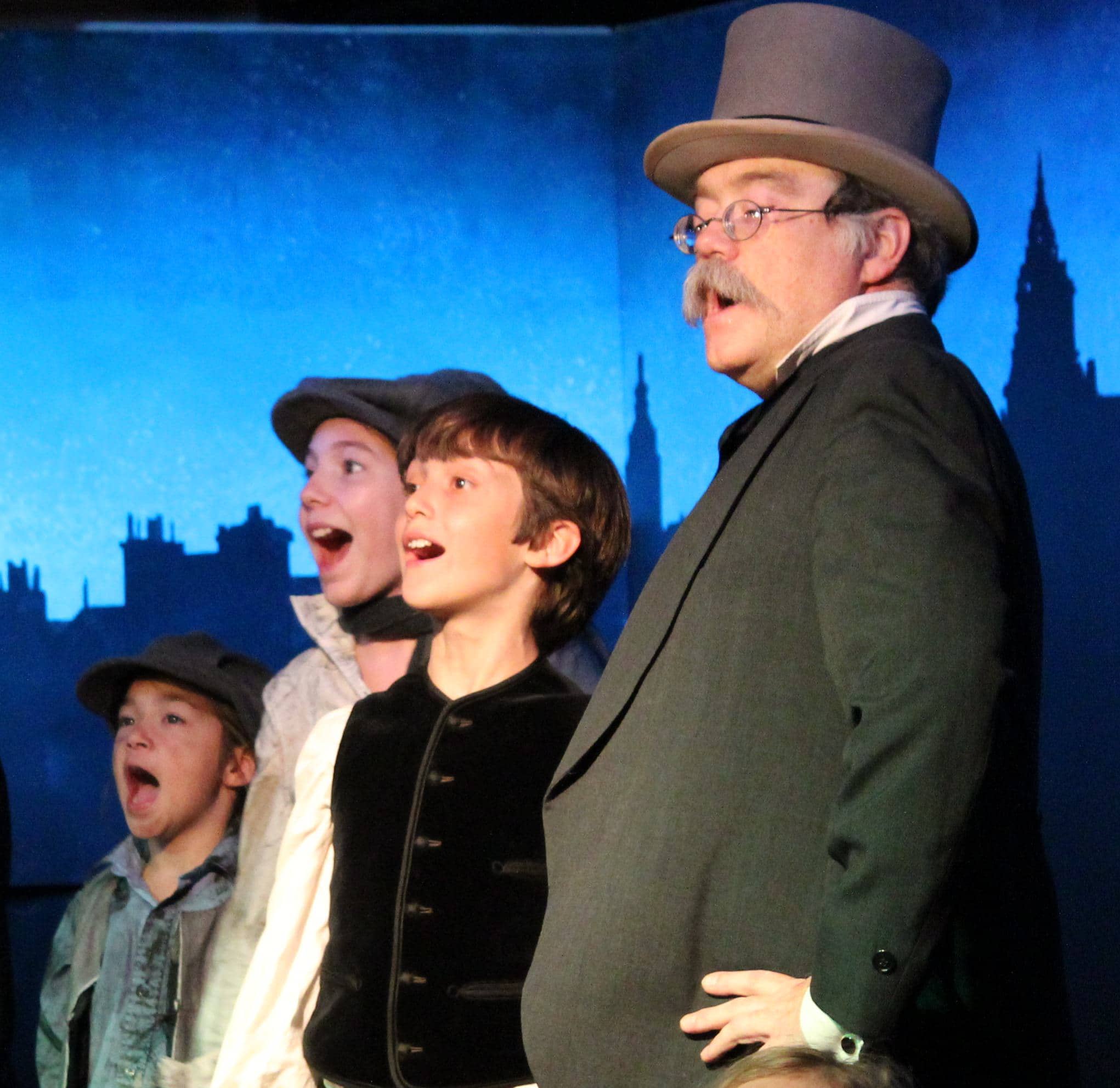 Oliver Twist begins with a dirty workhouse full of coughing children, where Oliver Twist (Colter Adams) is born. The famous “Can I have some more?” question follows, resulting in Oliver being cast off by Mr. Bumble (E. Augustus Knapp) into the care of a cruel undertaker and his wife, Tom Stamp and a scene stealing Mary Myers as Mr and Mrs. Sowerberry, where they sing “Welcome: The Undertakers Lament.” Oliver, unwilling to settle into a life as an undertaker’s apprentice, escapes to London (with an entertaining number, “LondonTowne”) and meets Fagin (also Tom Stamp) and his band of young pickpockets, including the feisty Jack Dawkins (Kaia Jefferson), where they sing about their pastime in the song “Take it From Me.” However, when Oliver is wrongly accused of stealing…he is arrested! What follows is a roller-coaster adventure, in which Oliver changes hands countless times and is put through several ordeals. Plot changes happen at a fast clip and can be hard to keep up with, but fortunately the production’s program has a helpful timeline included that make it easy to keep up. Will Oliver ever find a peaceful, loving home?
