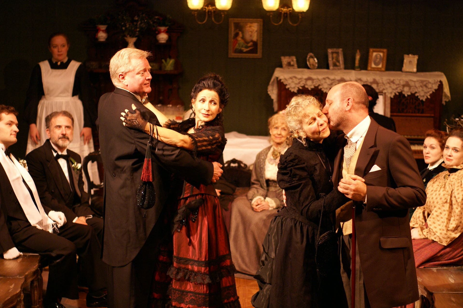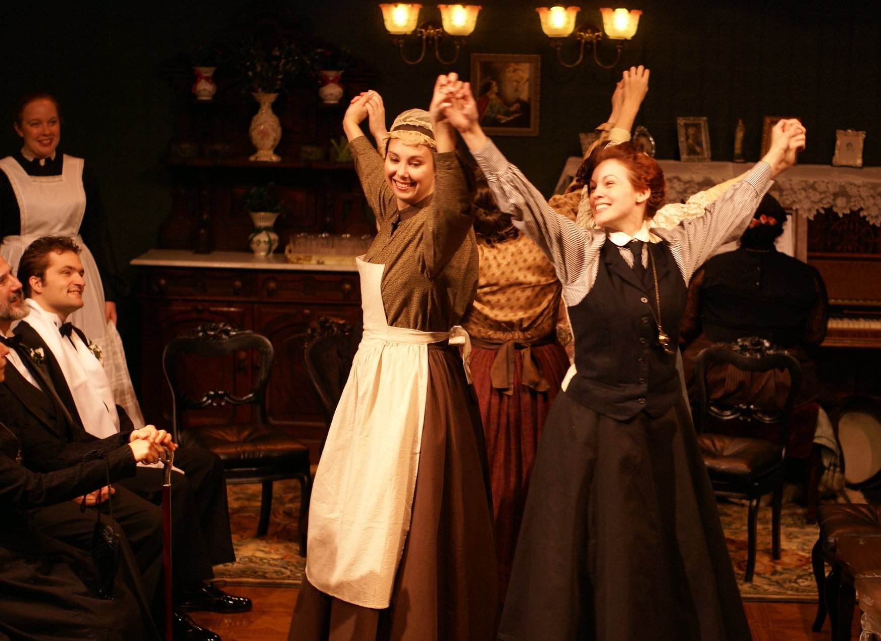 The costumes by Quotidian co-founder Stephanie Mumford adds to the authenticity with suits and flowing, high-waisted skirts that telegraphed perfectly the differing generations as well as the social standing of each character. They were also well suited to each personality. Lighting Designer Don Slater did a fine job of conjuring the warm glow of gas lamps and managed to create the cleverest snow I’ve seen on a stage.