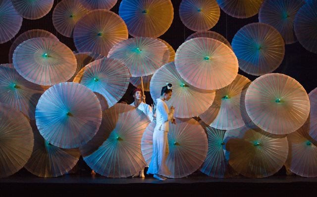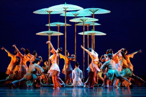 The opening prologue shows the program is more than just dance but a theatrical treat for the eyes and ears. It is the first of several times fog machines are used to help create the scene, and to point out where the river is on the stage. Set Designer Sam Leung later utilizes a bridge, trees, and beautifully crafted side-panels. It is a minimal set with most of the stage is reserved for the 36 dancers who star in this performance. Billy Tang adds expert use of lights and incredible scenery which is displayed by video.