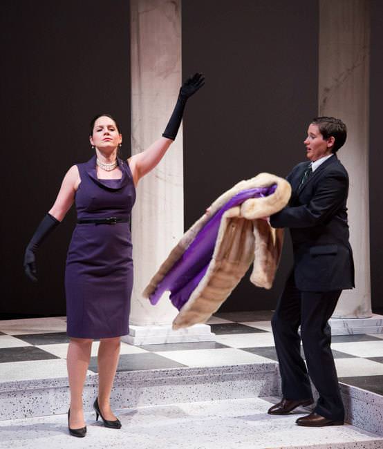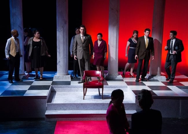 The staging is unique and clever, making use of a set by designer Greg Stevens that consists of four columns on a balcony. Director Steven Scott Mazzola uses the back of these columns as the public side of the White House, so some of the action actually takes place facing away from the audience as Tito addresses the nation and then returns “inside” to the audience for the more private conversations. It makes the simple set into an elaborate space. I’ve never seen so many impassioned moments played facing backstage. It worked well to draw us into these character’s lives. Fortunately, the singers were all so strong it didn’t matter if they faced a wall. The opera was in English and you could understand every word and hear every note. The English adaptation was done by Charlotte Stoudt.