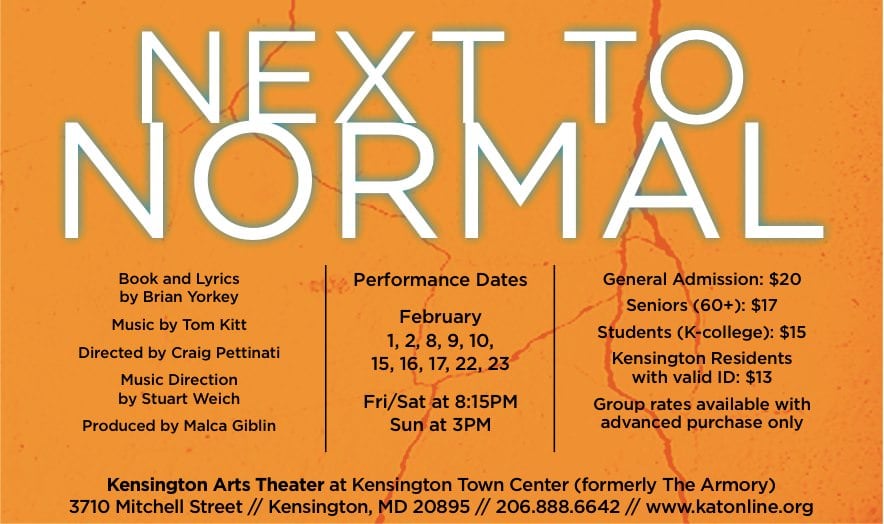 Next To Normal plays through February 23, 2013 at the Kensington Town Center – 3710 Mitchell Street, in Kensington, MD. For tickets, call (206) 888-6642 or purchase them online.