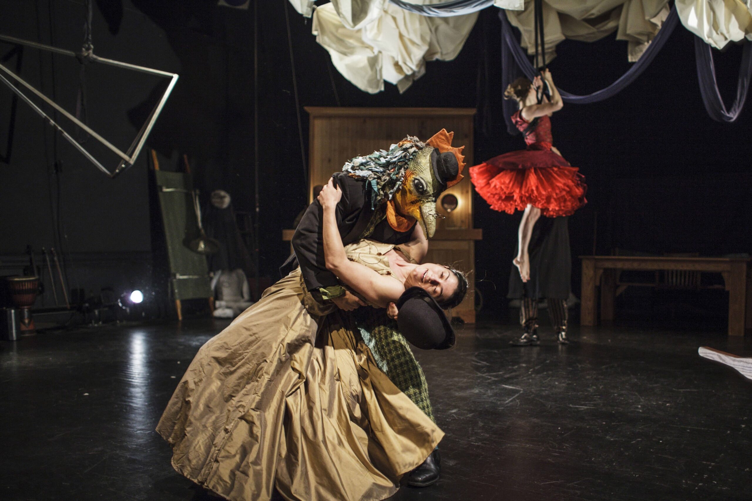 Prior to the performance, Klein mentions that they wished to create a living painting. At the start of the show, a large painted canvas begins to move as if it is, indeed, a living painting, as the actors swing while suspended on stage. Collaboration between talented designers Jeff Bird (furniture and wood), Lucrecia Briceno (lighting), Anshuman Bhatia (associate lighting), Adam Bright (technical), Carroll Durand (puppets), Brian Fairley (sound and projection), Beckie Kravetz (masks), Amanda Miller (costumes), and the Double Edge Ensemble (metal apparatus) fused well together to infuse life- and death- into otherwise still paintings. Additionally, direction by Stacy Klein, music and vocal direction by Lyudmila Bakshi, technical design and direction by Adam Bright, and associate technical and lighting director Andrew Todd add well to this dream (or is it a nightmare?) come to life.
