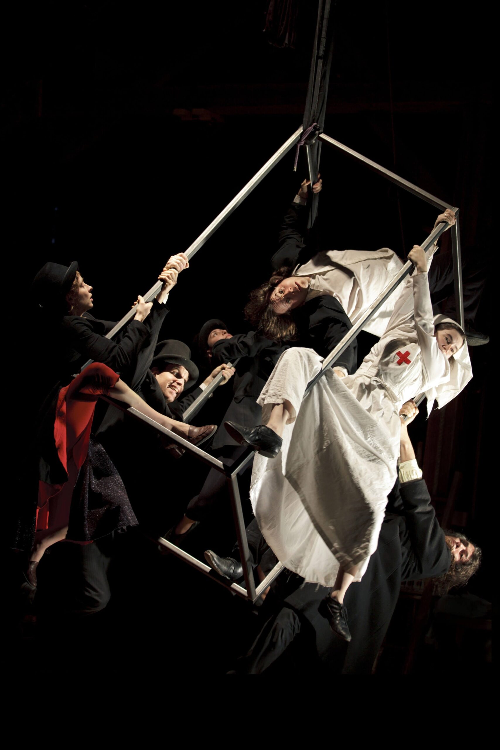 Take key events of the past century. Add some music by a Russian composer. Throw in television, radio, and video game transmissions and broadcasts. Frame it with Marc Chagall’s paintings, focusing on the floating brides and animals. Finally, mix in some incredibly talented physical performers skilled in circus arts, dance, and more. Give them some silks from which to suspend themselves, a host of costume changes, and a great deal of conflict. Though it may seem surreal, it is neither “only” a pleasant dream nor a nightmare: welcome to the twentieth century- that is, The Grand Parade (of the 20th Century), a project by Double Edge Theatre currently playing at Arena Stage.