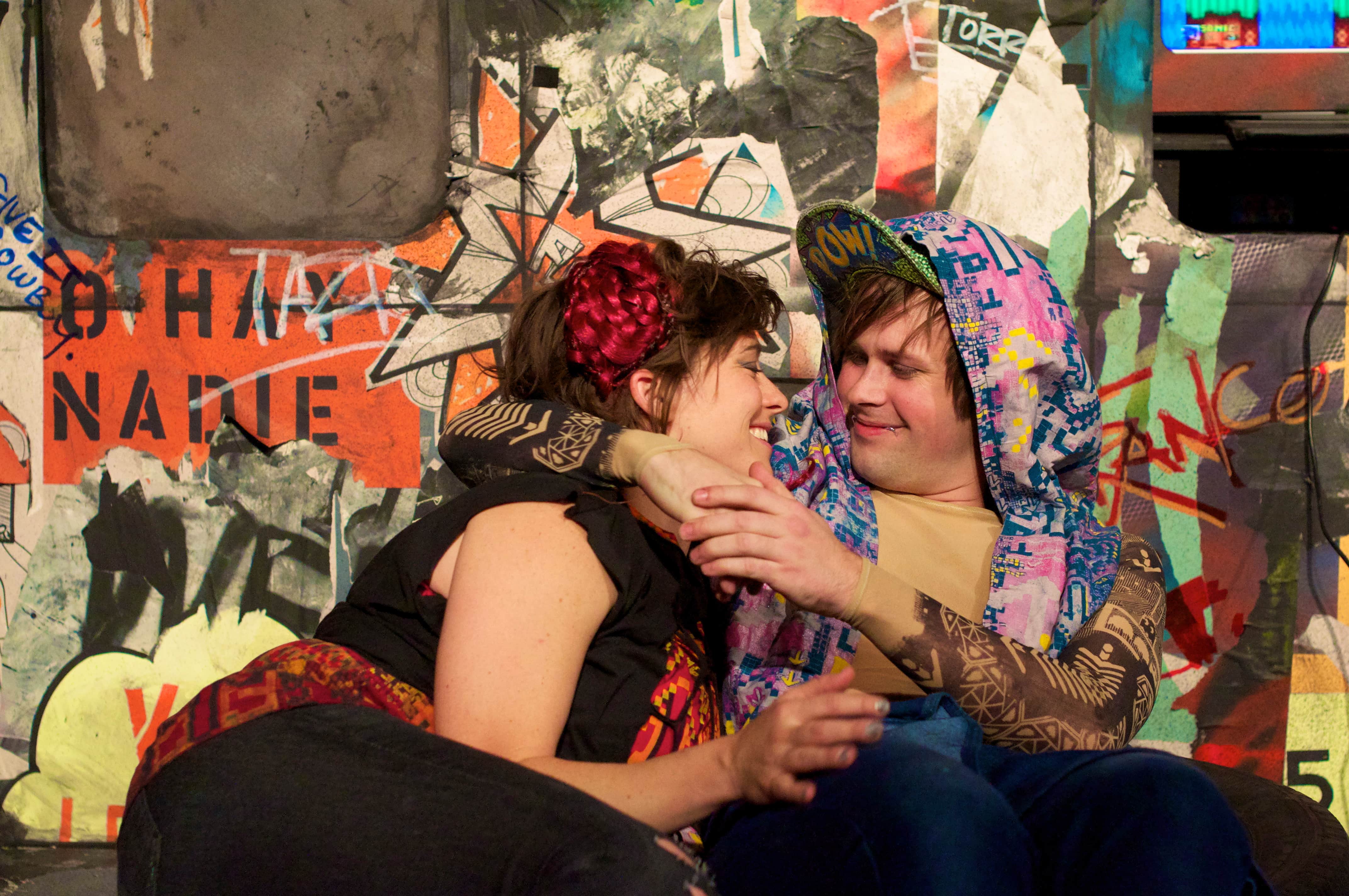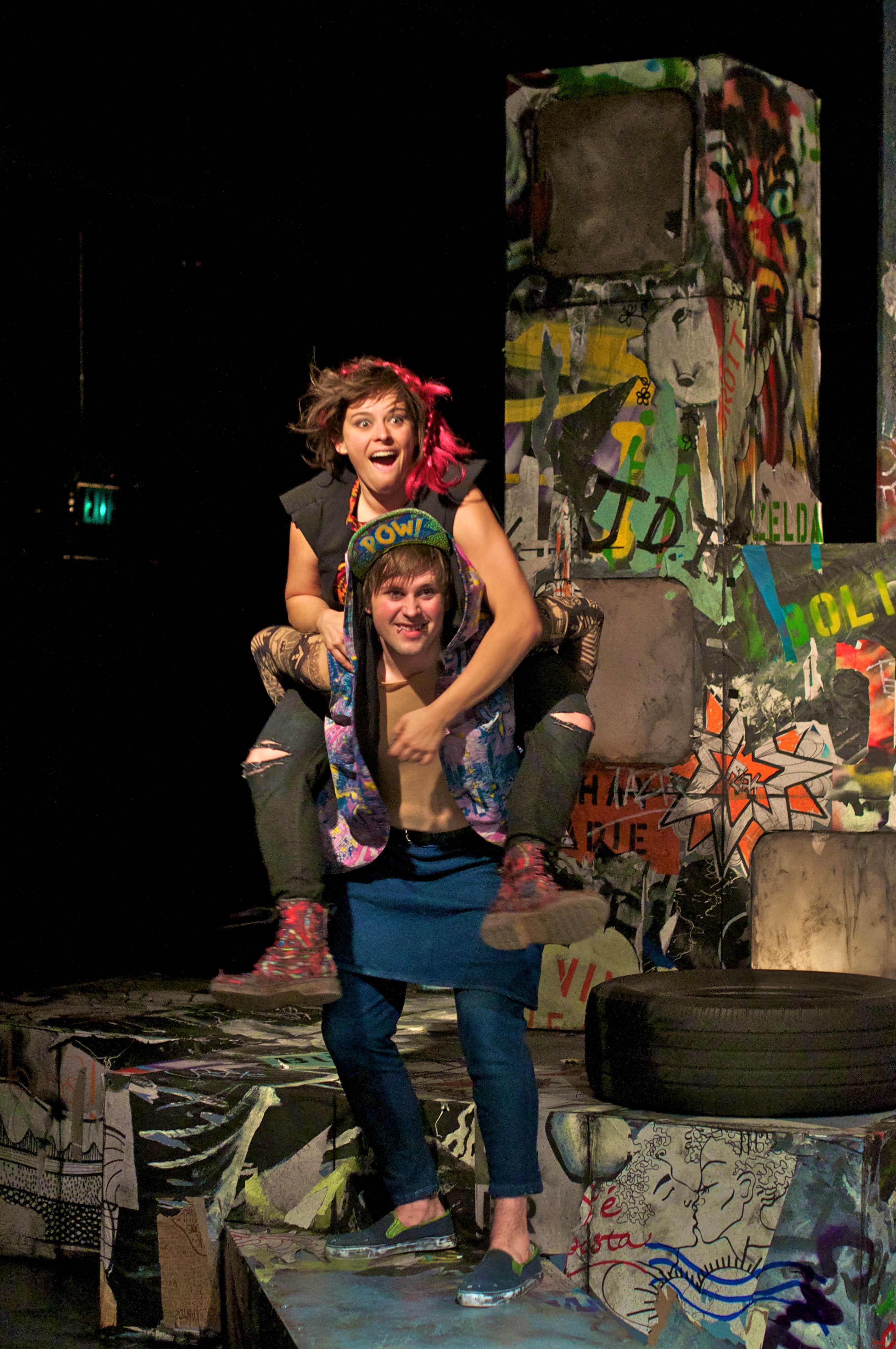 The focus of the production revolves around the waning hope for true love between Mori (Nathan Fulton) and Maura (Genevieve DeMahy). Thick as thieves with constant quarrels a tempestuous love brews between them, tucked away deep beneath the surface of their rough exteriors. Both characters are guarded individuals who relate on a subconscious level; neither fully able to express themselves or admit to themselves that there is true love until it’s too late. This dawning realization sends both Fulton and DeMahy on a quest across time to find one another, defying gender boundaries in the process—Fulton transforming from a boy of the streets into a broken girl and DeMahy from a rough gritty female into a shy and demure boy.