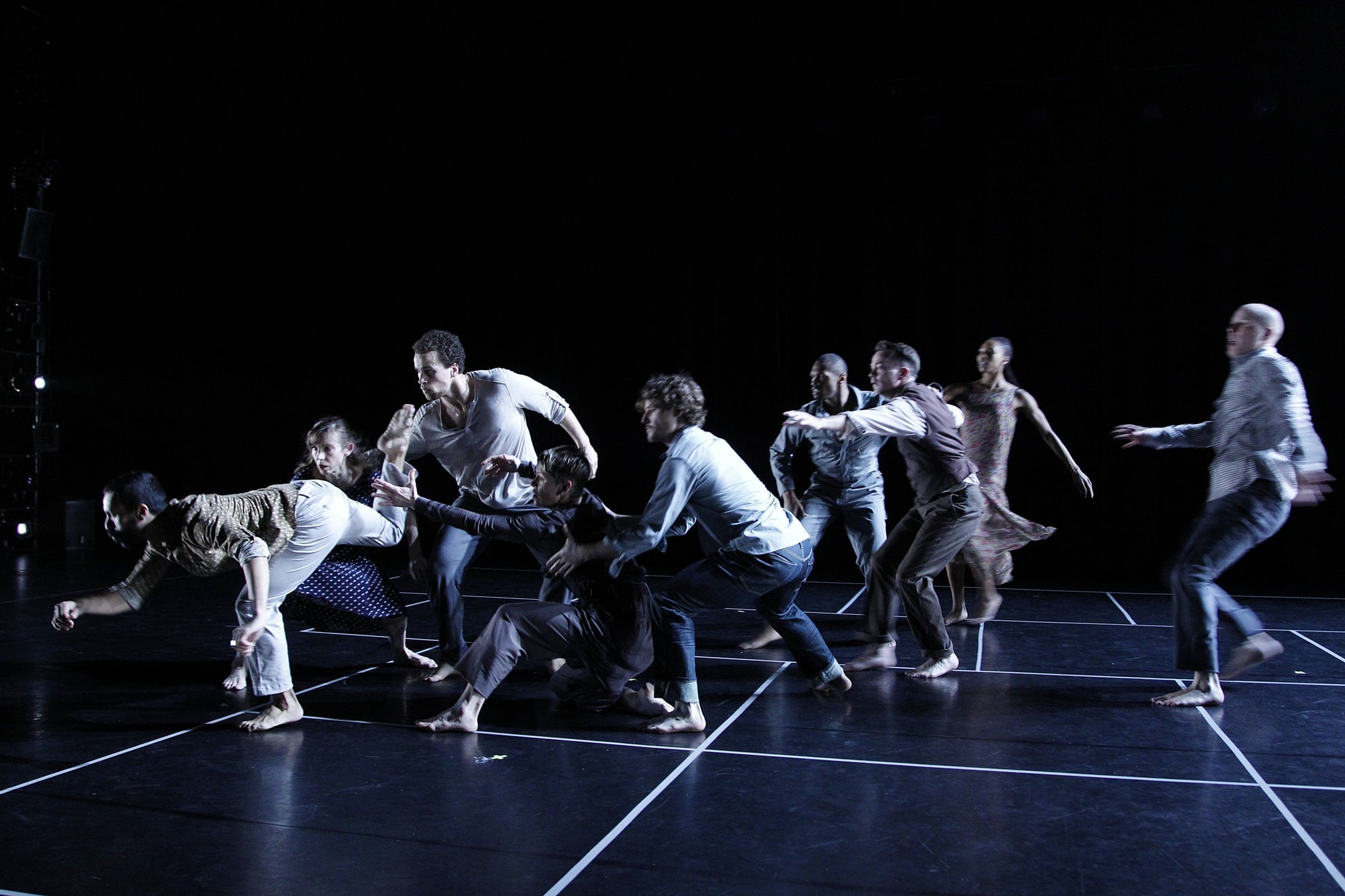 But oh how these dancers can tell a story! Carrying black stools back and forth, carefully placing them so the dancers don’t fall, the 15-member ensemble moved effortlessly about the stage, sensitively lit by Robert Wierzel. It’s enjoyable to watch the tiny blonde with her cropped hair and the sexy redhead bouncing about and fearlessly jumping on the guys (dancers and actors). One male actor/dancer pops up throughout the hour-long piece as if he were Nijinsky, himself, dancing the final sacrifice.