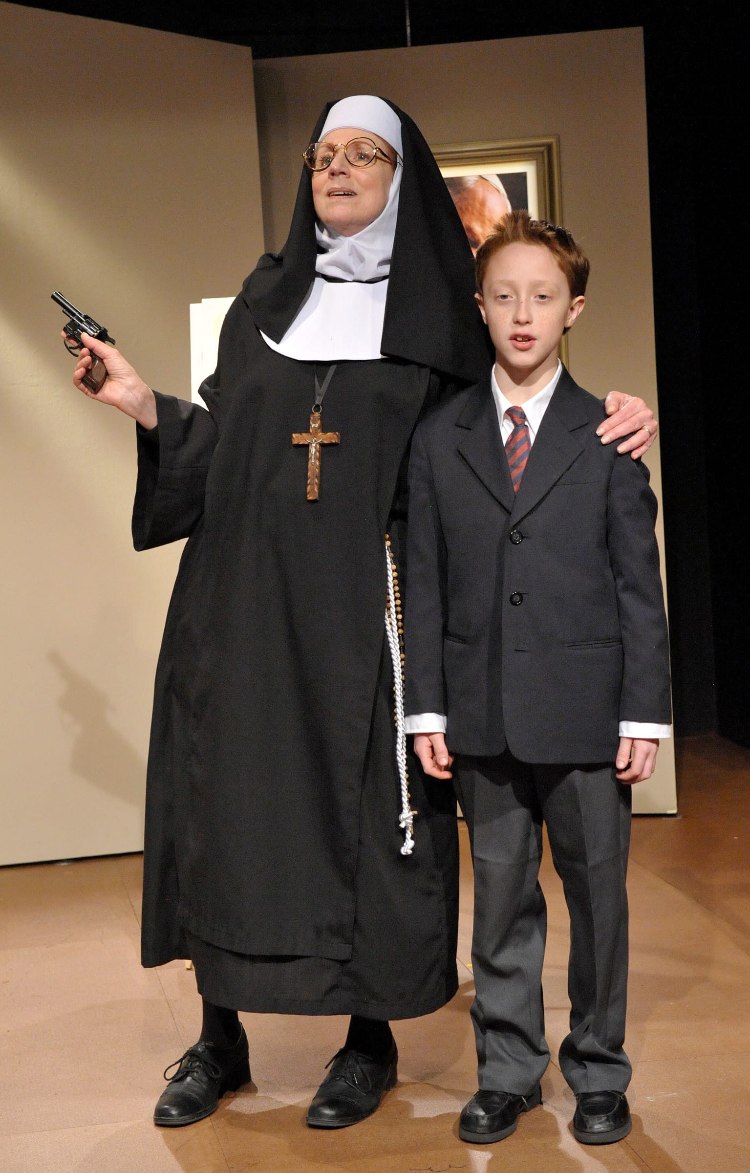 Brown will take you on a rollercoaster ride throughout this production— and keep your eyes out for little Thomas (Drew Sharpe) her up and coming protégé. Perhaps the cutest young actor to take to such a bizarre role, Sharpe fits right into the Catholic student mold that Durang has set for him, and adds another complexly comedic layer to this zany production.