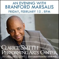 An Evening with Branford Marsalis performed for one night only on Friday, February 15, 2013, at 8 pm at the Clarice Smith Performing Arts Center—3800 Clarice Smith Performing Arts Center at the intersection of Stadium Drive and Route 193 (University Boulevard) at University of Maryland in College Park, MD. For upcoming events, please check their calendar.