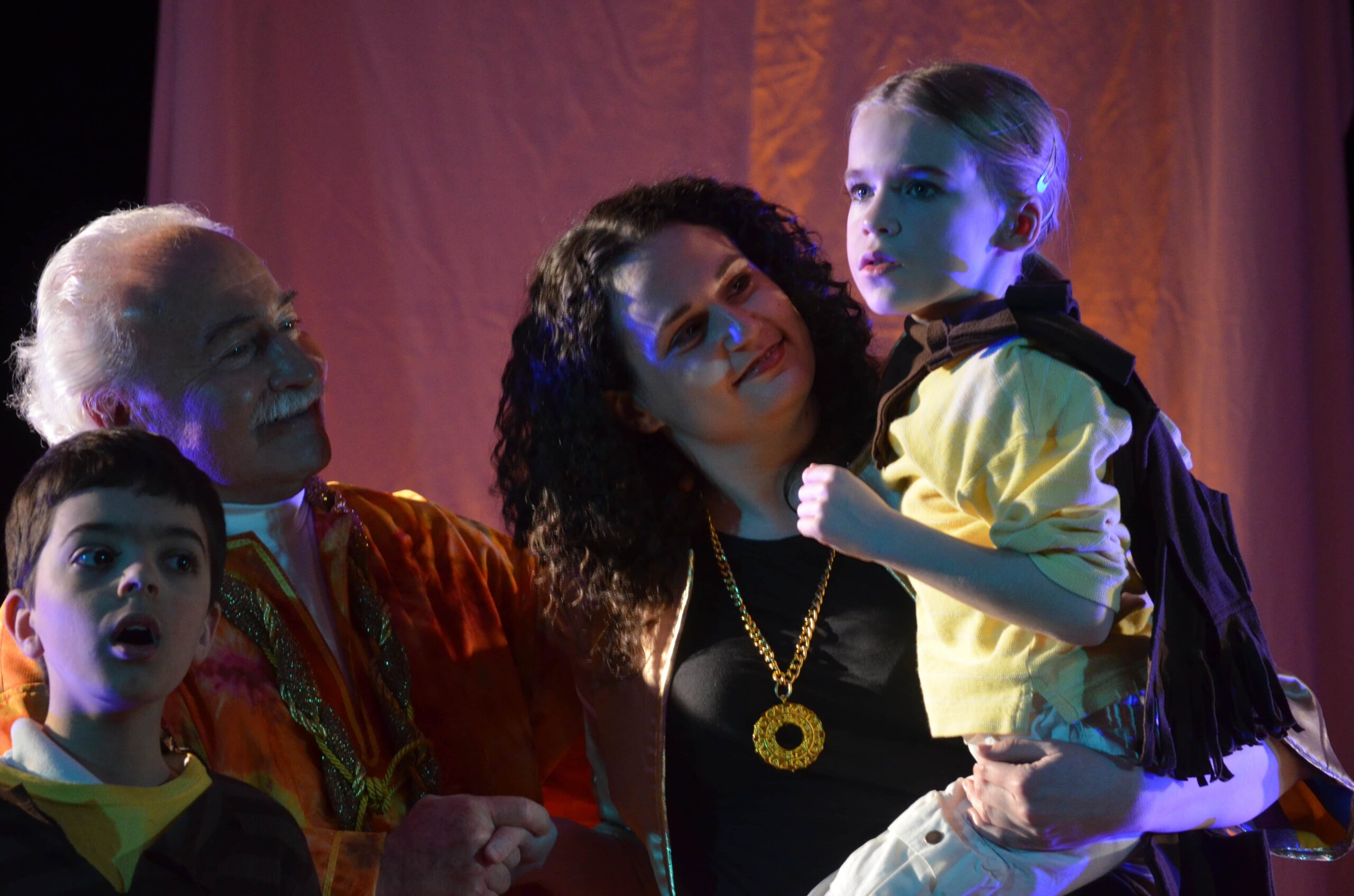 Chalice Theatre has produced a charming production that utilizes the 37 colors identified in Joseph’s dreamcoat to represent various settings within the play. It’s also complemented by ribbons, human mirrors, puppets, and a group of 12 boys and girls from age 6-17, who portray the 12 brothers in this triumphant exhibition of exuberance. Musical accompaniment is provided by Music Director Barbara Schelstrate on the piano, along with Maestros Bob Kline on keyboard, and Pete Nuwayser on percussion. Together they accomplish something wonderful – they don’t overwhelm or drown out the actors, and provide beautiful accompaniment.