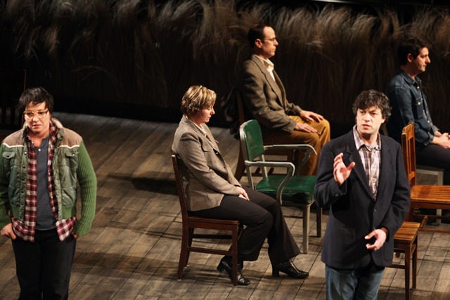 The two productions are not without their (admittedly minor) issues. The set, designed by Robert Brill is evocative of small-town America: prairie grass, simple wooden chairs and tables, and a large billboard-like structure. But while the set fits the tone of the production, many of the transformations of the stage feel unnecessary. Little is gained by turning the setting wholesale into the Fireside Lounge where Matthew met his murderers, and the prison guard pacing in the background doesn’t add anything to an interview with one of Matthew’s killers. The set of Ten Years Later also includes a number of additional chairs in the background to represent the growing conversation around the subject of hate crimes and tolerance, but the chairs are never used or directly relevant to the action. Both plays are at their best when they can focus directly on the people involved.