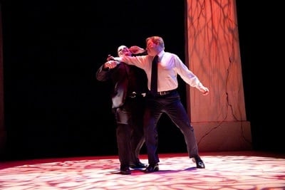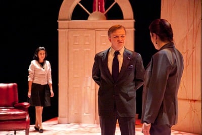 Playgoers have time to take in the scene, designed by Dr. Thomas Donahue, before the action starts, and there are plenty of clues as to what’s coming. A low marble stage surrounded by pillars evokes ancient Rome, but the contemporary double-doors in the corner suggest that we’re really looking at something neo-classical: Washington, DC, a fit setting for the sharp suits and power politics. The cleverest part of the set may be Brutus’s bed, a simple platform that doubles as a table and settles seamlessly into the stage with a “thunk” so satisfying it’s a shame the sound isn’t worked into the action. But before we’ve even started, the production already seems a little ahead of itself – both the pillars and bed are dripping with blood, which seems odd for a play traditionally concerned with whether or not there will be an assassination.