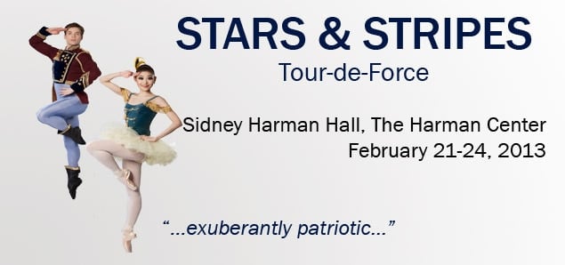 Tour-De-Force: Stars & Stripes today, Sunday, February 24, 2013 at 1 and 6 PM at The Washington Ballet at Shakespeare Theatre Company’s Sidney Harman Hall – 610 F Street, NW, in Washington, DC. For tickets, purchase them online.