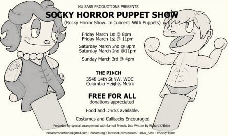 The Socky Horror Picture Show plays through March 3, 2013 at The Pinch – 3548 14th St NW, in Washington, DC. There is no admission fee (donations welcome), but to reserve seats email nusassproductions@gmail.com.