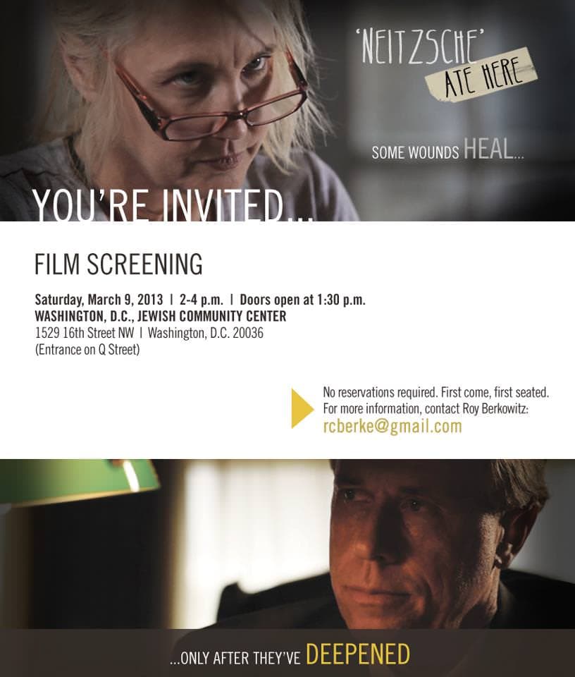 Local Playwright Roy C. Berkowitz will be joined by Producer/Director Matt Starr and cast members Gail Griffith and Bruce Jacklin of the film version of his one-act play ‘Neitzsche’ Ate Here this Saturday, March 9th at 2:00 PM at the DC Jewish Community Center – 1529 16th Street, NW, in Washington, DC.
