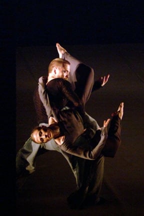 Throughout this piece, the three friends struggle to break out of the monotony of their current situation. As the lighting shifts to a warm reddish lavender hue, the song “The Message” by Moondog takes us into a deeper part of the journey as we see the friendship, betrayal, success, and failure of these men. The repetition of each sequence in the choreography gave me the feeling of trying to get somewhere but not knowing fully how to do it or how many attempts it might take to get there. At times I felt like I was intruding on an intimate moment, as when Henrikki Heikkilä buried his face in his hands, which was so simple and yet so personal. Another sequence that resonated was when the three men were plodding and nodding as they traveled, which reminded me of the daily grind. Throughout their journey, they staggered in confusion, became stuck in the muck, rose above (soaring and leaping freely), brought each other down by fighting and resisting, helped each other up, and in the end continued as we all do, as we all can.