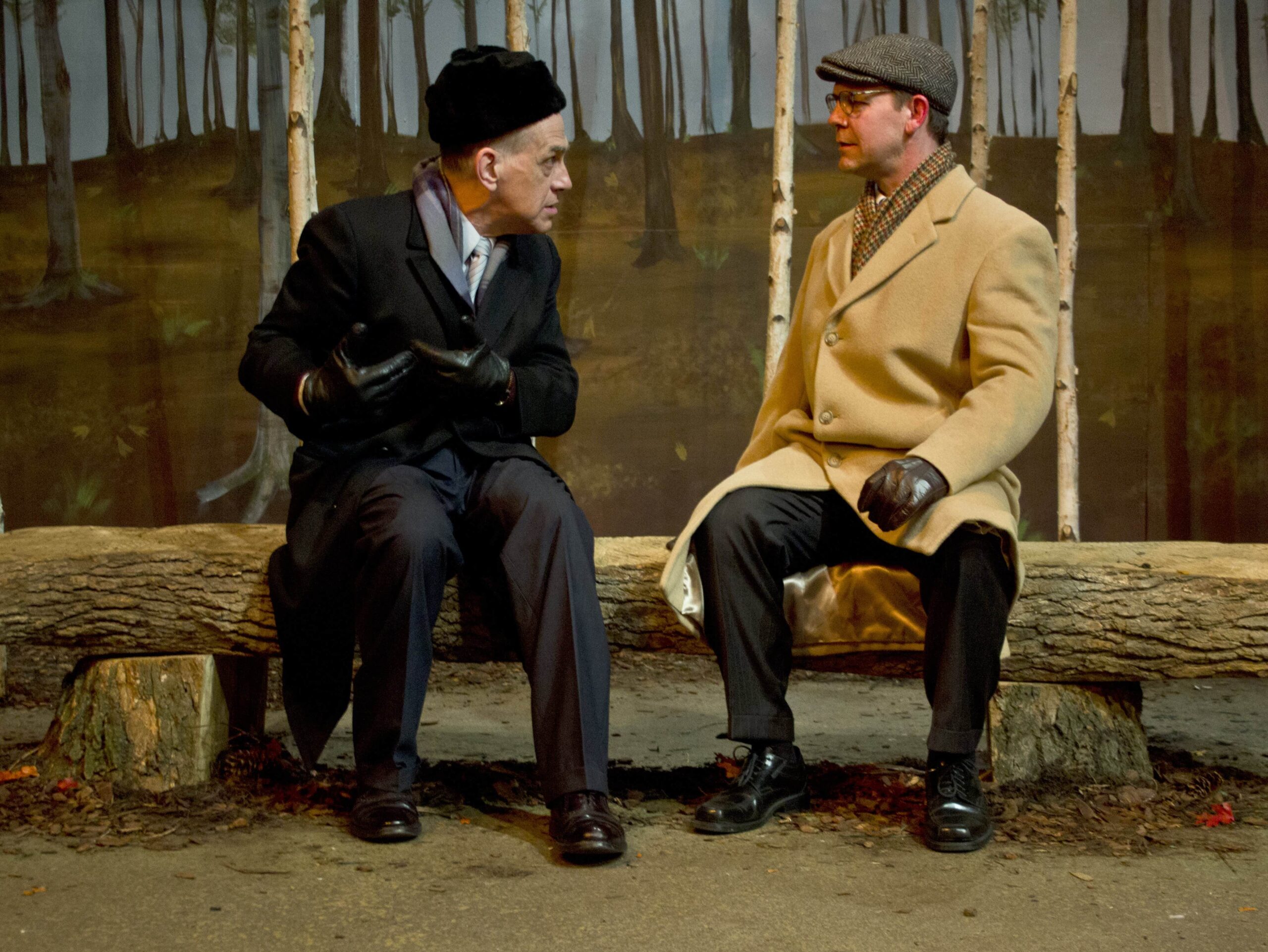 The actors’ costumes change over the changing seasons – with Honeyman donning the ubiquitous trench coat and Botvinnik wearing a fur hat through the winter scene, but both kept their dapper and timeless suits throughout.