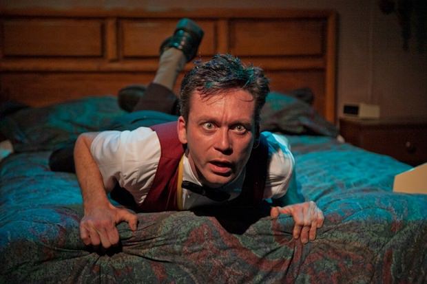 The play opens on Carmichael (Mark A. Rhea), a seedy-looking man in a seedy-looking hotel room. He seems desperate and on the edge of something…something that will not end well. Enter Mervyn, the hotel-receptionist, boxer-shorts guy. Played by Keegan Company member Bradley Foster Smith, Mervyn is a hapless hotel clerk with a deep desire for something—anything—to happen. He lives in his imagination where he is the hero who always gets the girl.