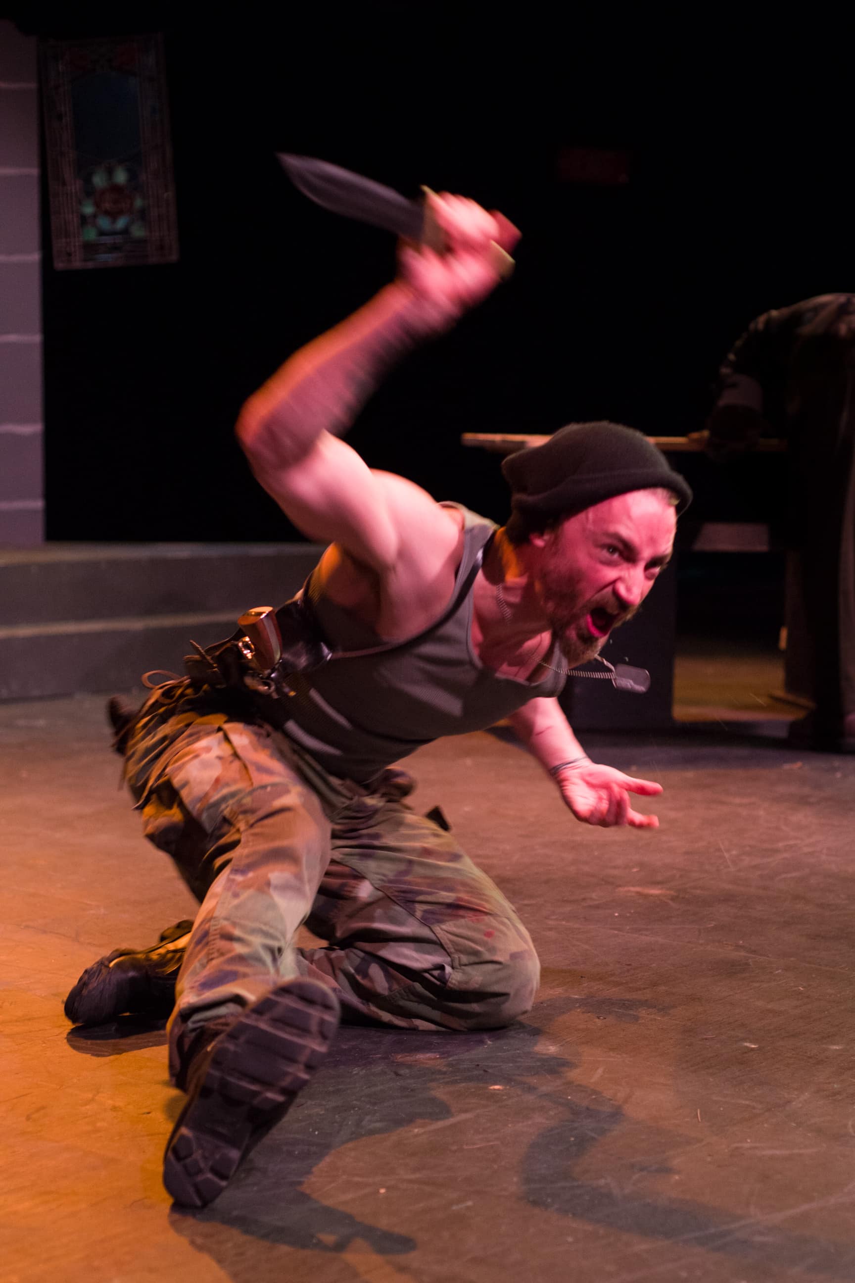 Working with a stellar all-male cast, this is a testosterone-driven and not-so-complimentary view of the murder that men do and the continual cycle of revenge and barbarism men engage in – indeed, we do not even have a conventional Lady Macbeth. Some subtle homoerotic touches are also interspersed into the mix. This Stage production of Macbeth is the theatrical counterpart of Roman Polanski’s cinematic cinematic Macbeth with it’s emphasis on gore, blood, and carnage. The unconventional yet totally convincing direction of Akerley (aided by Assistant Directors Tyler Herman and Annalisa Dias-Mandolay) includes the fusion of Roman Catholic elements, a stunning set piece where the song “Amazing Grace” is beautifully juxtaposed, and – of course – Haitian voodoo elements. The Sound Design by Frank Di Salvo, Jr. is particularly striking and consists of natural sounds and discordant,quirky, and unsettling chords befitting this material.