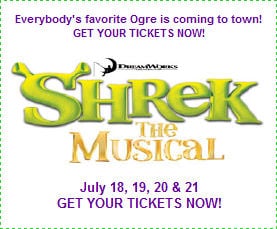 Shrek The Musical plays through July 21, 2013 at Glenelg High School— 14025 Burntwoods Road in Glenelg, MD. For tickets are available for purchase online or in person at the door.