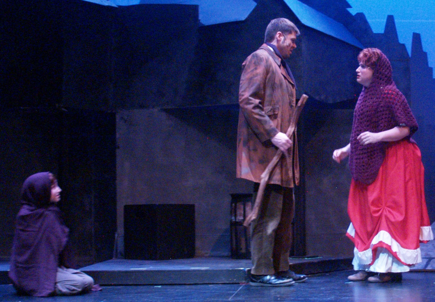Set Designer Jerry Hilyard creates a beautiful backdrop of Victorian London for this production. Working silhouettes of the city rooftops into the scenic design, Hilyard draws a clear demarcation barrier between the impoverished slums and knob hill. Adding a stone arch between the two sides of town adds a platform with scenic depth and elevation to the stage, giving the company a bit more space in which to expand their movements. Hilyard’s use of fog to add to the dreary atmosphere is a quaint touch that enhances the location of the musical.
