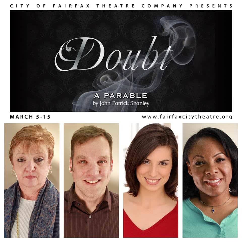 Doubt plays from March 5 – 8 and March 12 – 15, 205 at The City of Fairfax Theatre Company, performing in Fairfax City’s Old Town Village, 3950 University Drive, in Fairfax, VA. Free parking is available. $17 tickets are available online. Remaining seats, if available, will be sold for $20 at the door one hour prior to performance times. Thursday, Friday and Saturday evening performances begin at 7:30 PM and Sundays at 2:00 PM.