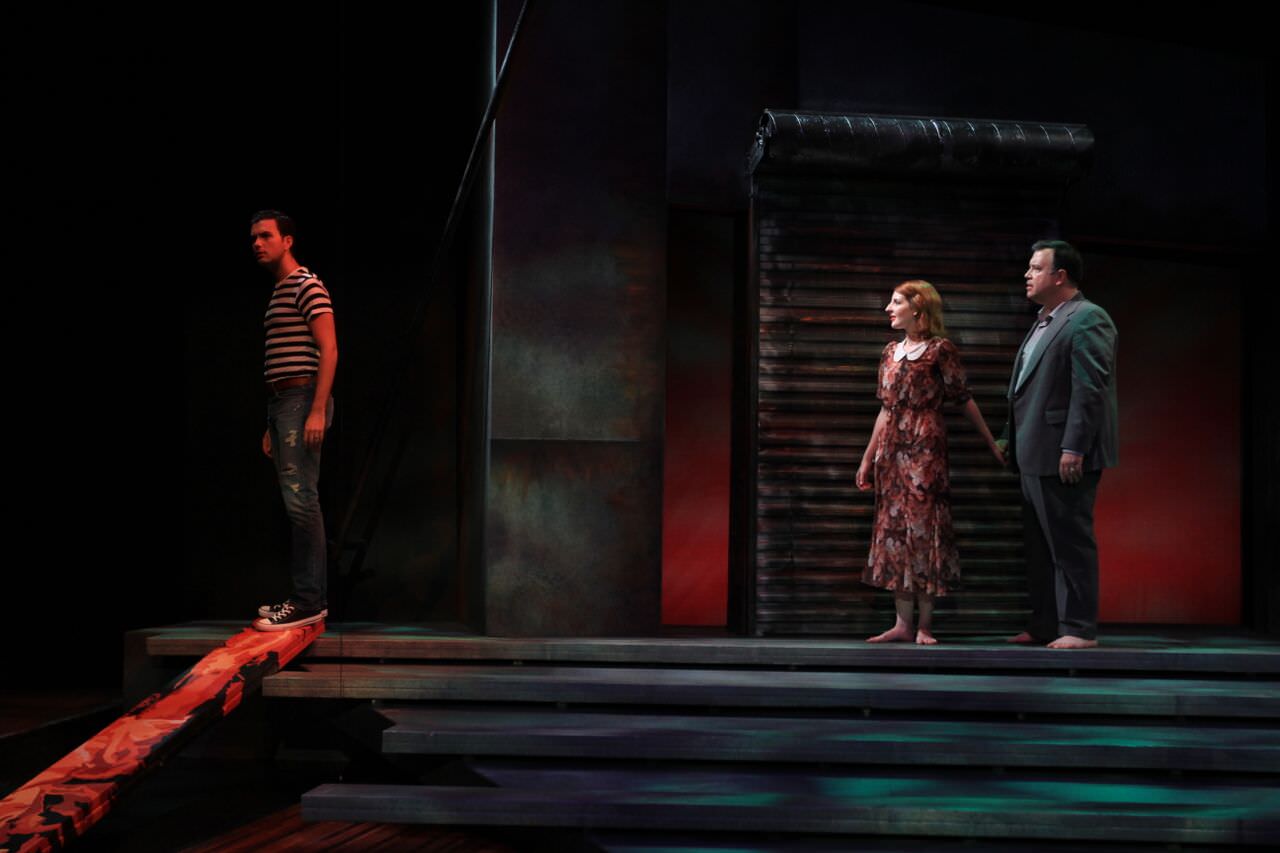 When Eurydice dies on her wedding day and arrives in the underworld, she’s robbed of her memories by the waters of the river Lethe – represented here by a striking image of a rain-filled room she exits via a storefront roll-down metal door. Her father, whom she does not recognize, patiently takes it upon himself to rebuild her mind, reintroducing her to the things she once loved, like language, books, music… and memories of her husband. It’s then that Orpheus’ own grief compels him to reunite with her, an action that prompts a second misfortune in a play that has more than its share of tragedy.