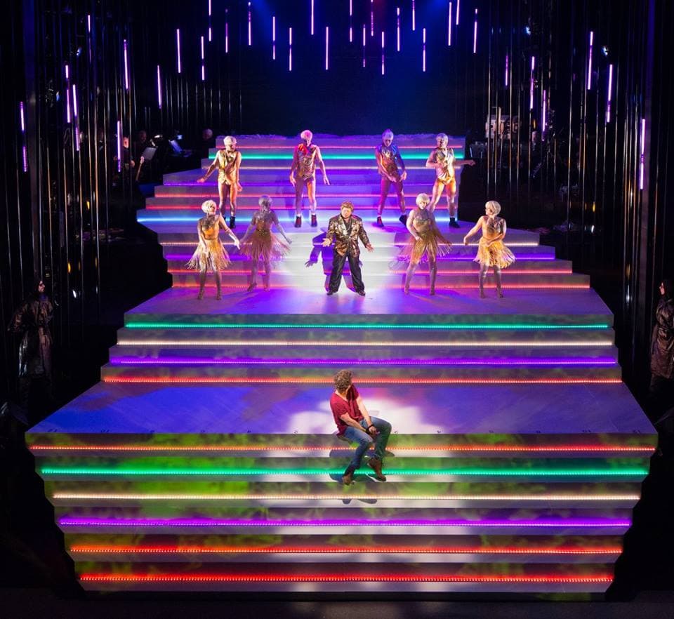 Roman Tatarowicz’s stationary set of a sleek white staircase serves as all of the locales in the familiar story, identified and enhanced by John Hoey’s digital projections and a few telling movable props – the low white tables and goblets of the Last Supper; the purse of silver coins paid for the kiss of Judas; and the gun, proffered to him by Annas, with which he kills himself (a chilling current replacement for the usual hanging rope). Joe Doran’s theatrical lighting sets the tone of the shifting scenes, from blood red for the flagellation of Christ and the suicide of Judas to bright flashing colors at Herod’s Palace to the white pallor of the entombment. Contemporary costumes by Linda Bee Stockton define the characters and their affiliations, with youthful streetwear for Jesus, the disciples, and followers; business suits and long black coats for their persecutors; and glitzy metallic, sequined, and fringed attire for the profaners of the temple and the courtiers of the king. All successfully serve in visually transporting the action from the Biblical era to the present.